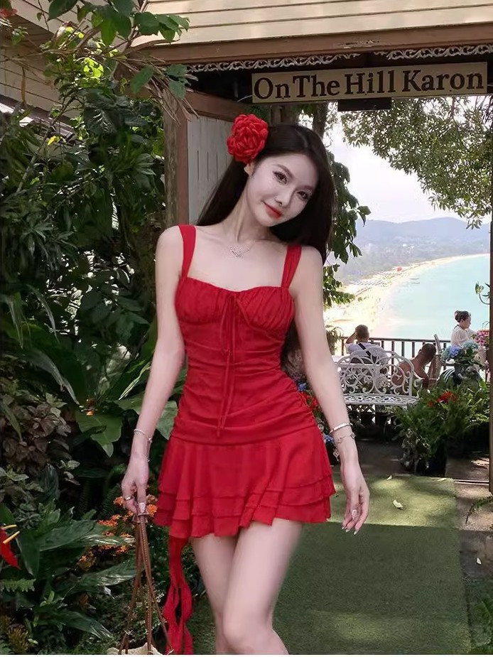 해변 휴가 스타일 불규칙한 디자인 레드 비키니 서스펜더 원피스 스커트 수영복으로 허리를 슬림하게 만들어줍니다.스토어 가기
