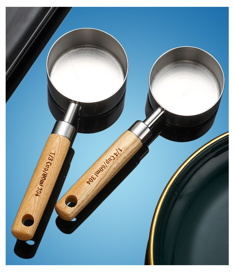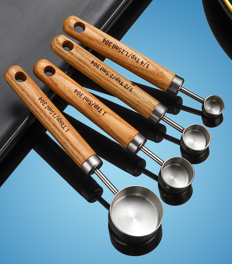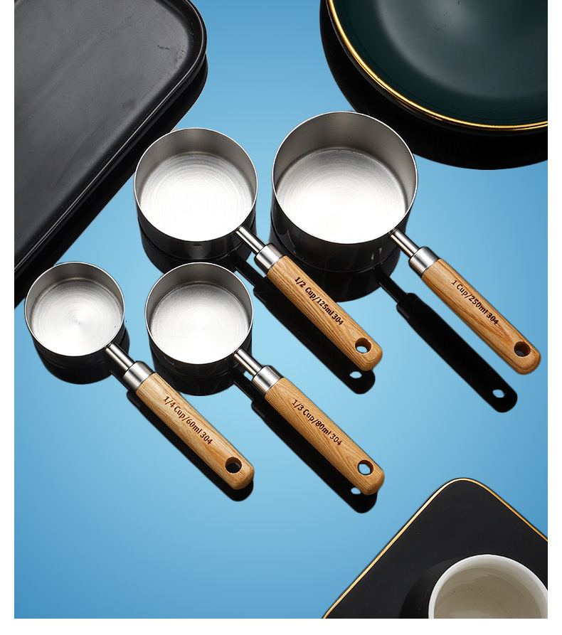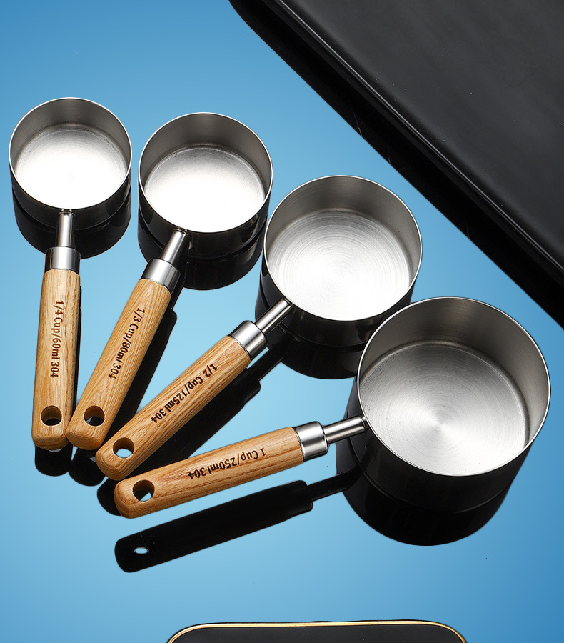 304 스테인레스 스틸 측정 스푼 측정 컵 세트 나무 손잡이 측정 컵 측정 스푼 4 피스 세트 스케일 골드 측정 스푼 측정 컵 8 개