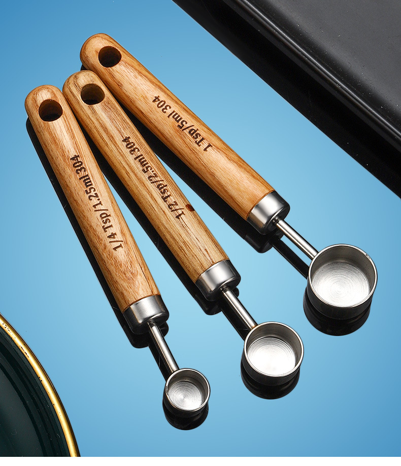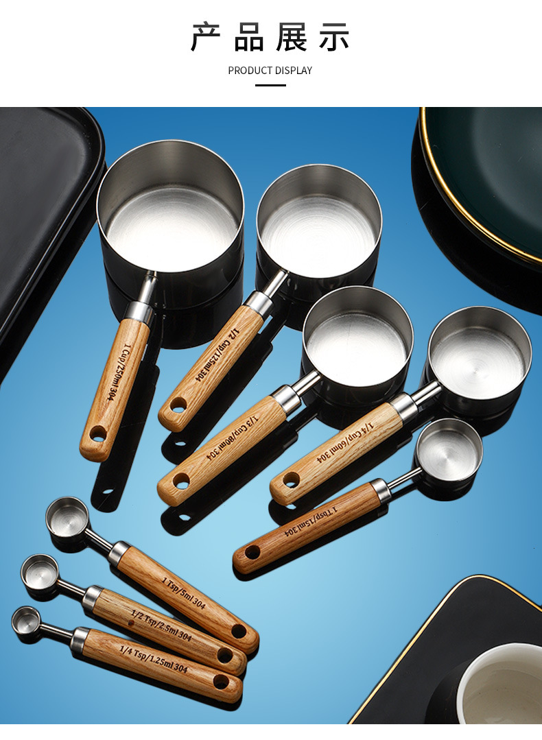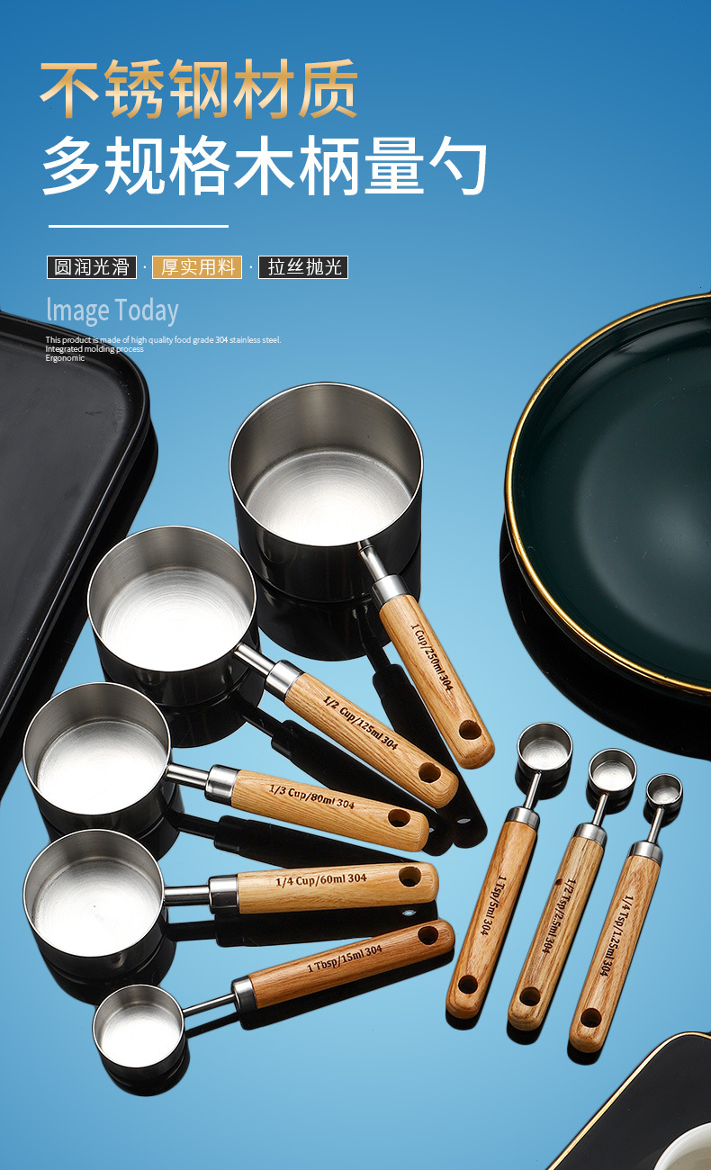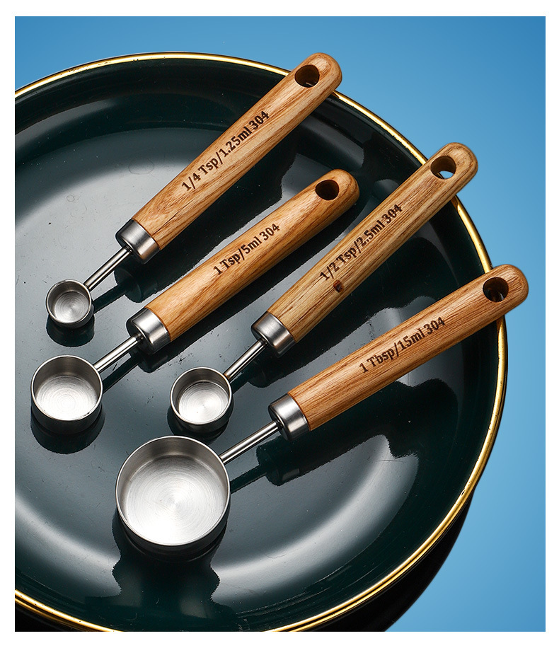 304 스테인레스 스틸 측정 스푼 측정 컵 세트 나무 손잡이 측정 컵 측정 스푼 4 피스 세트 스케일 골드 측정 스푼 측정 컵 8 개
