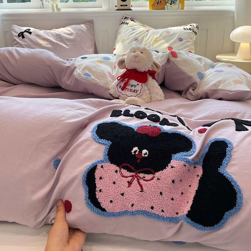 귀여운 수건 자수 워시 코튼 4종 세트 A급 만화 침대 시트 이불 커버 소녀 하트 학생 기숙사 3종 세트