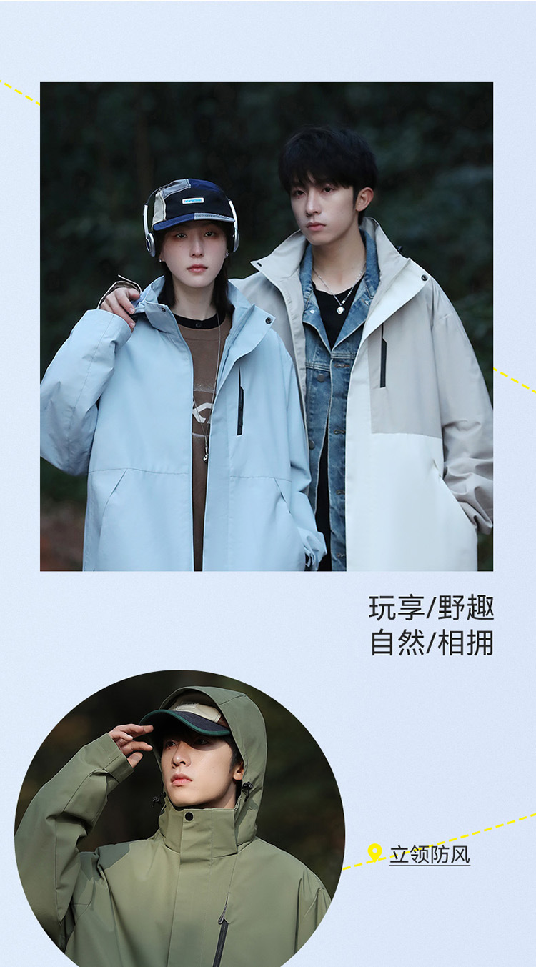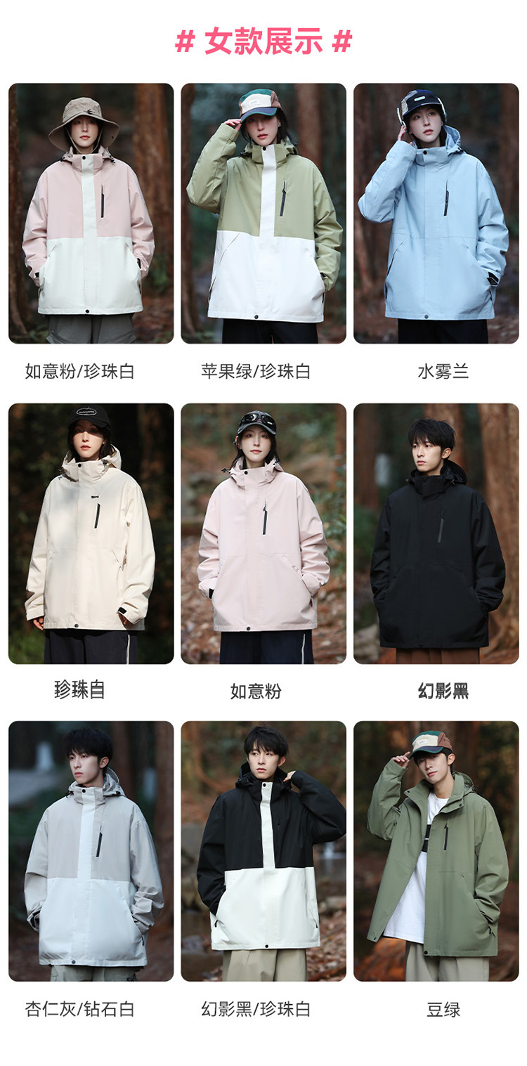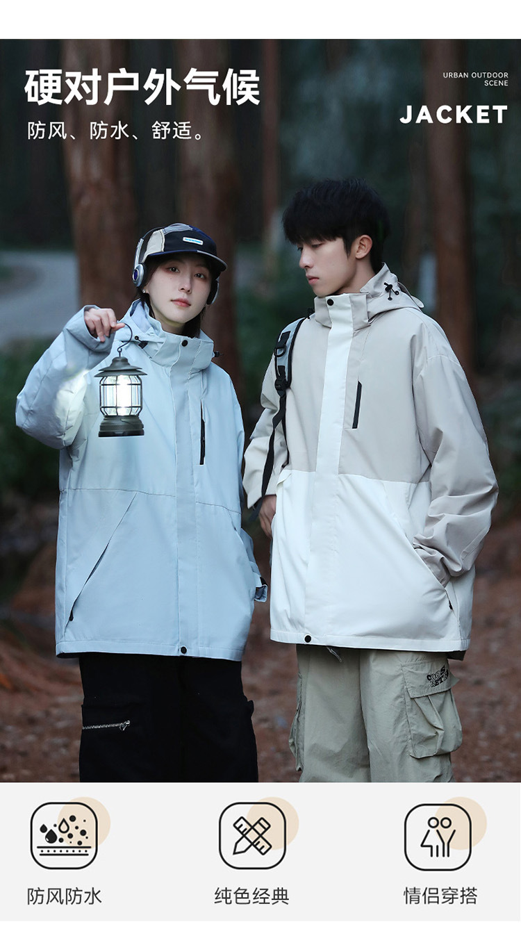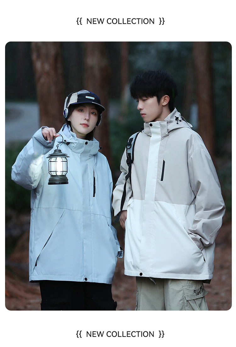 남성과 여성을 위한 봄과 가을 새로운 야외 루즈 커플 재킷, 컬러 블록 방수 재킷, 후드 스포츠 및 레저 재킷스토어 가기