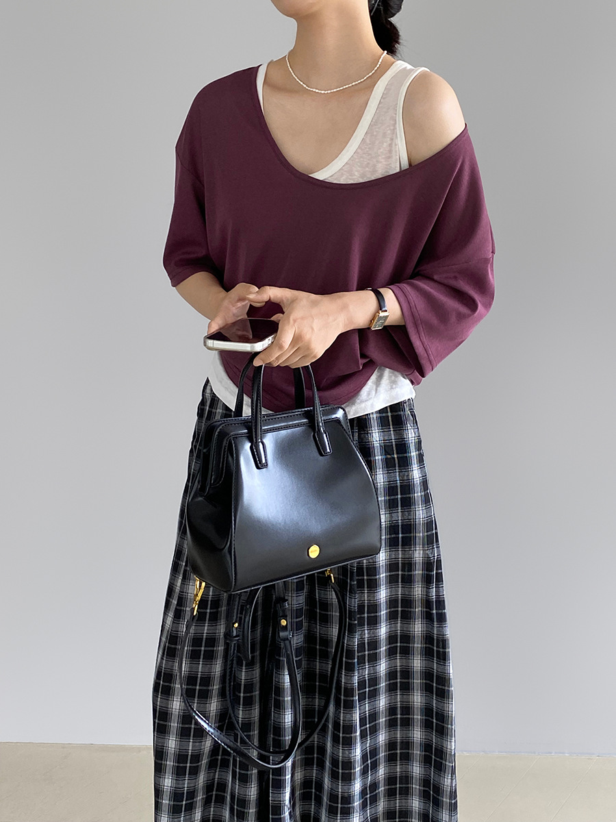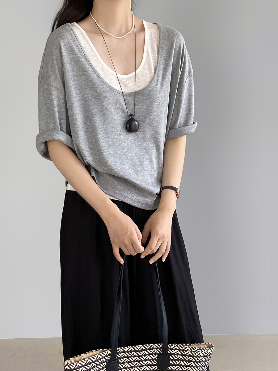 【특가 상품, 반품 불가】Jiangzuo 한국 스타일 U넥 솔리드 컬러 반팔 여성 티셔츠 여름 릴렉스 탑 6298