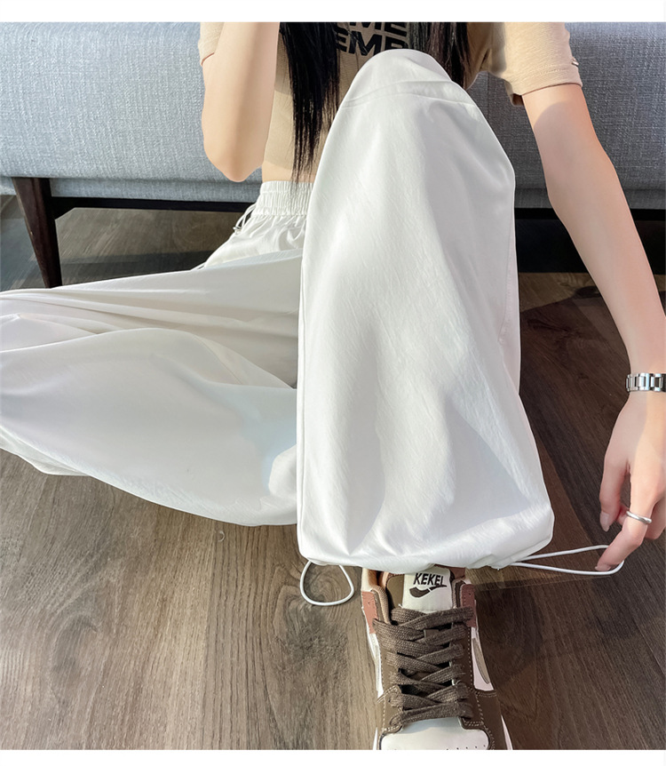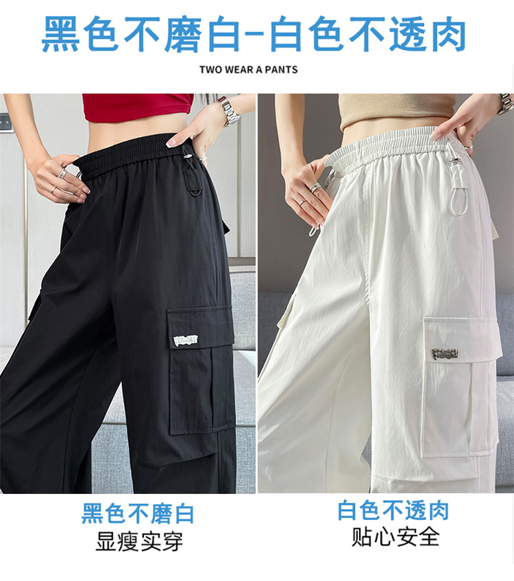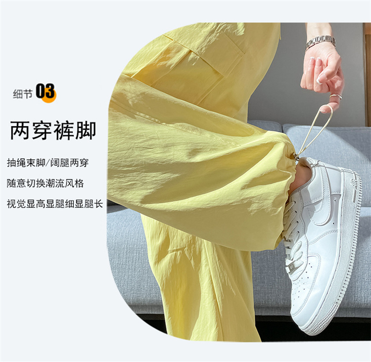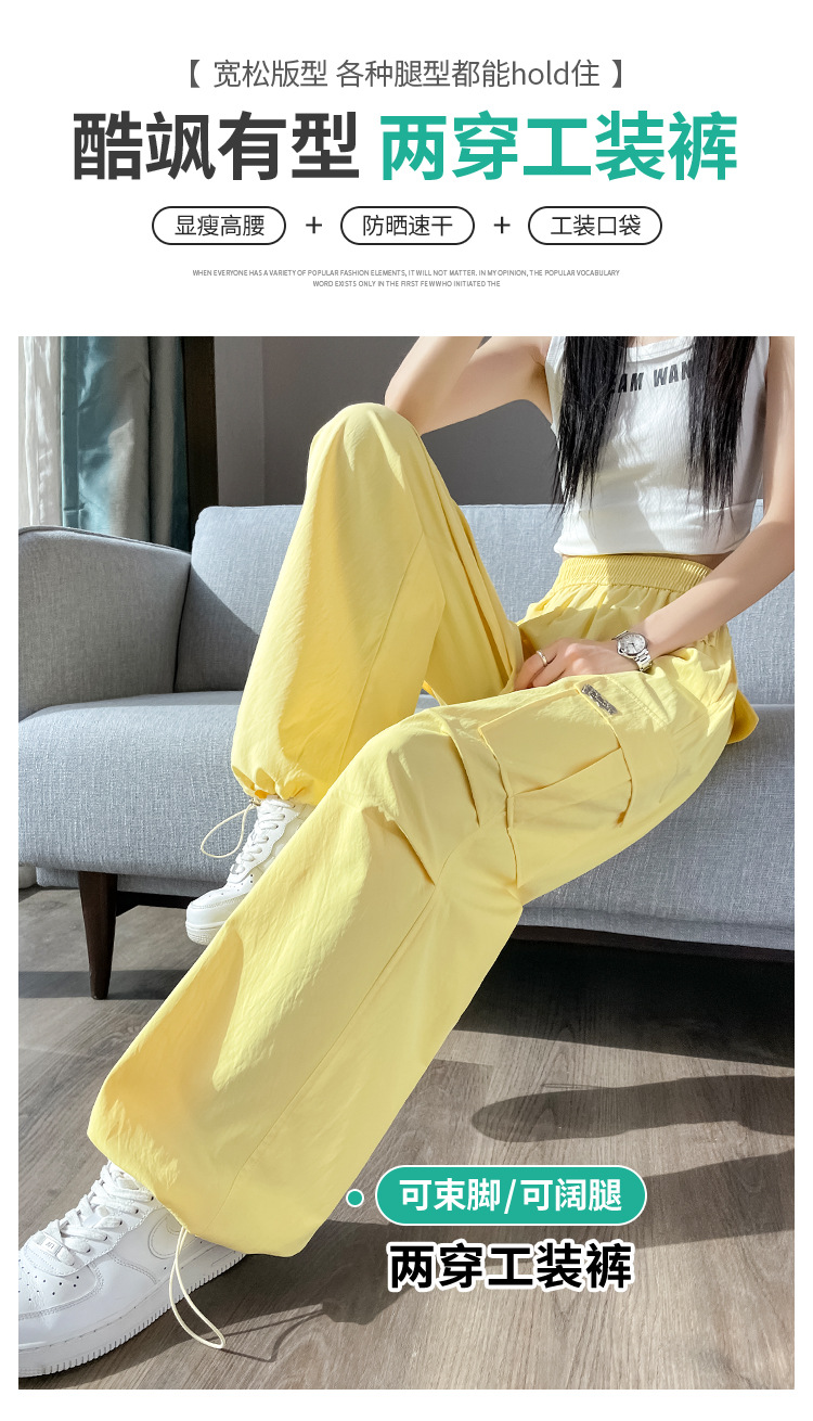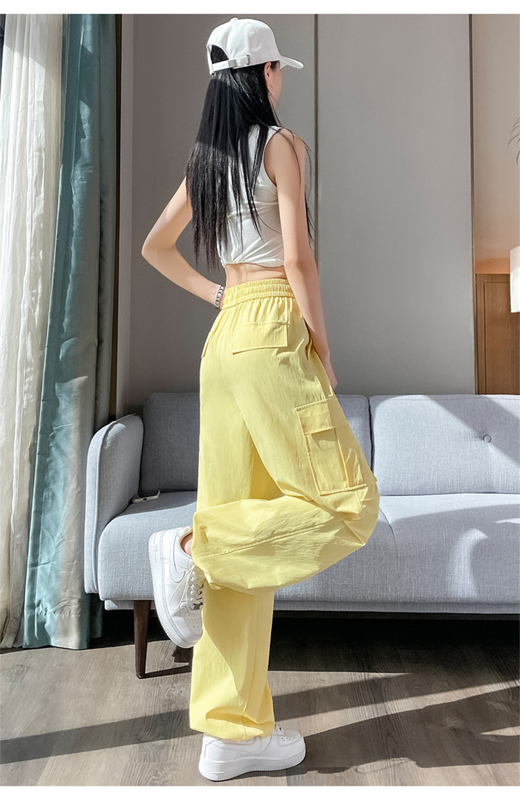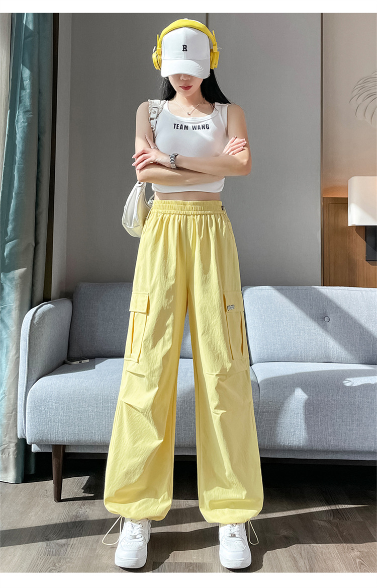 여름용 여성용 노란색 속건 작업복 얇은 얼음 실크 와이드 팬츠 신축성 있는 하이 웨이스트 스트레이트 레그 타이 하이킹 스포츠 바지스토어 가기