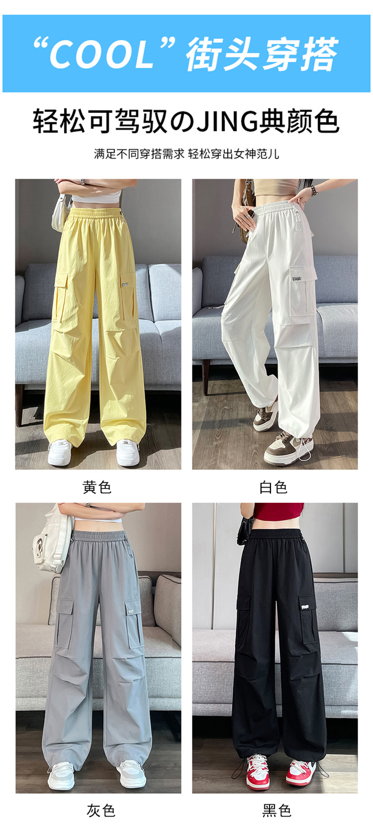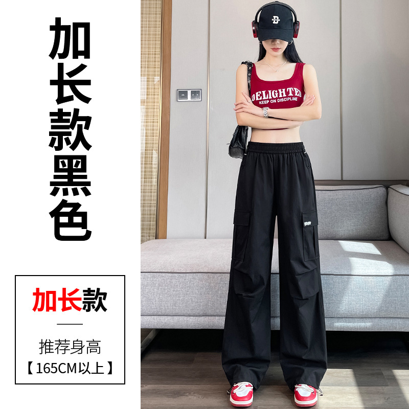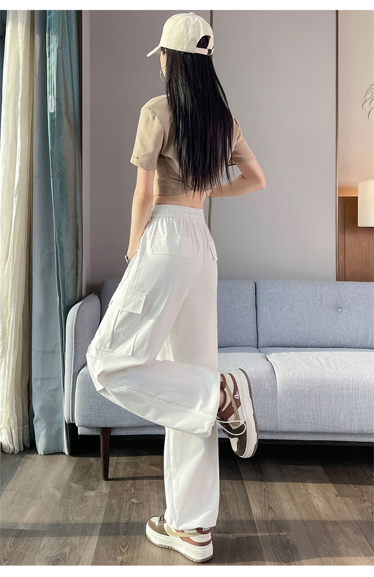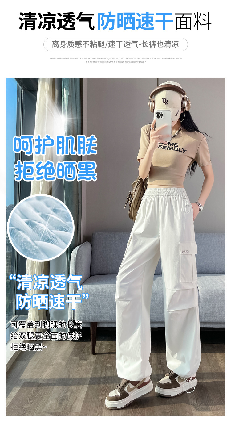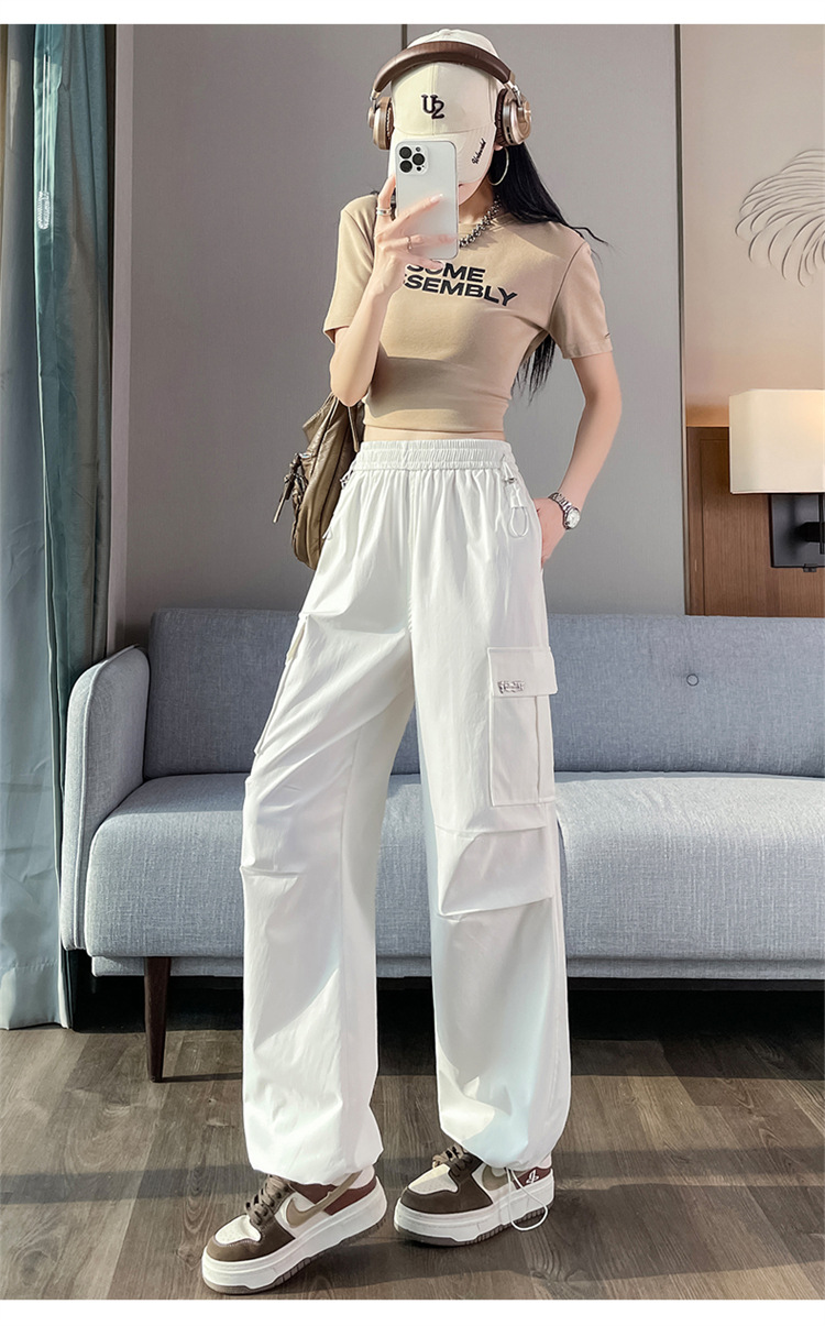 여름용 여성용 노란색 속건 작업복 얇은 얼음 실크 와이드 팬츠 신축성 있는 하이 웨이스트 스트레이트 레그 타이 하이킹 스포츠 바지스토어 가기