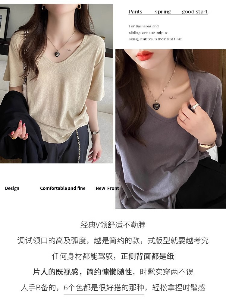 여성용 흰색 반팔 티셔츠 v 넥 2025 여름 새로운 느슨한 대나무 반팔 탑 아이스 실크 얇은 스트레이트 헤어