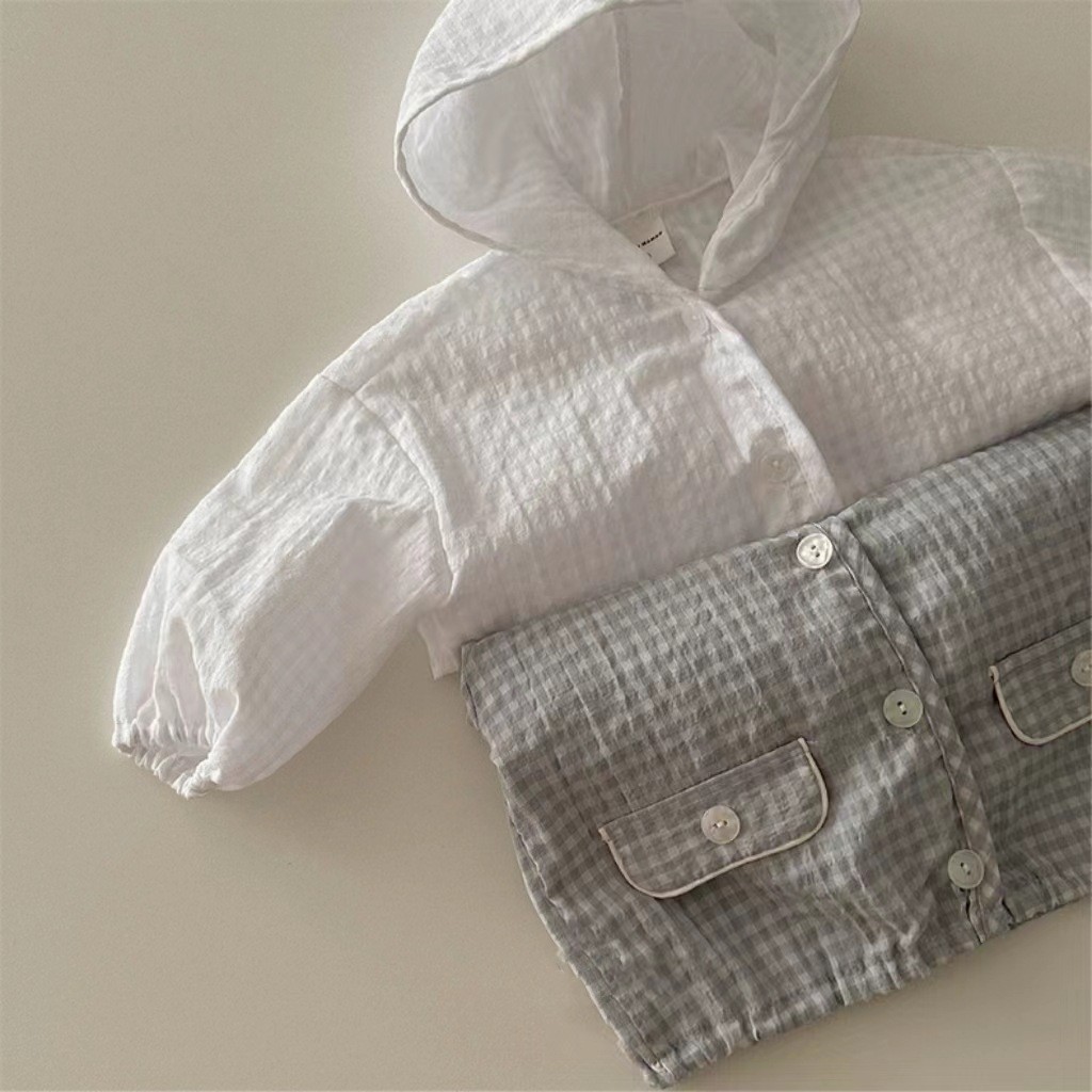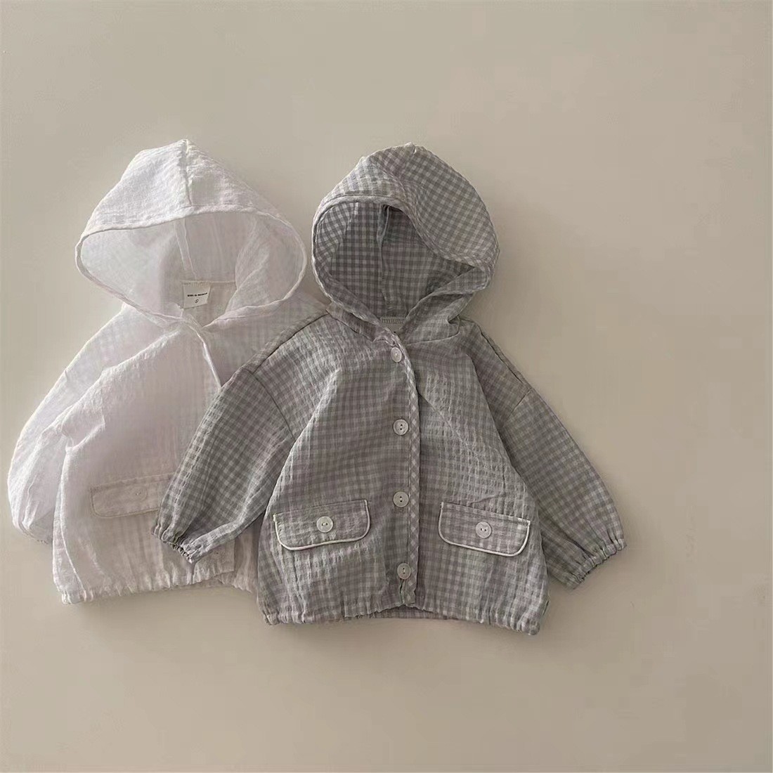 ins 한국어 버전 새로운 봄, 여름 얇은 격자 무늬 자외선 차단제 에어컨 재킷 소년 소녀용 다용도 긴팔 카디건 탑