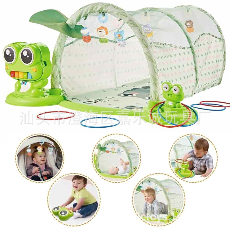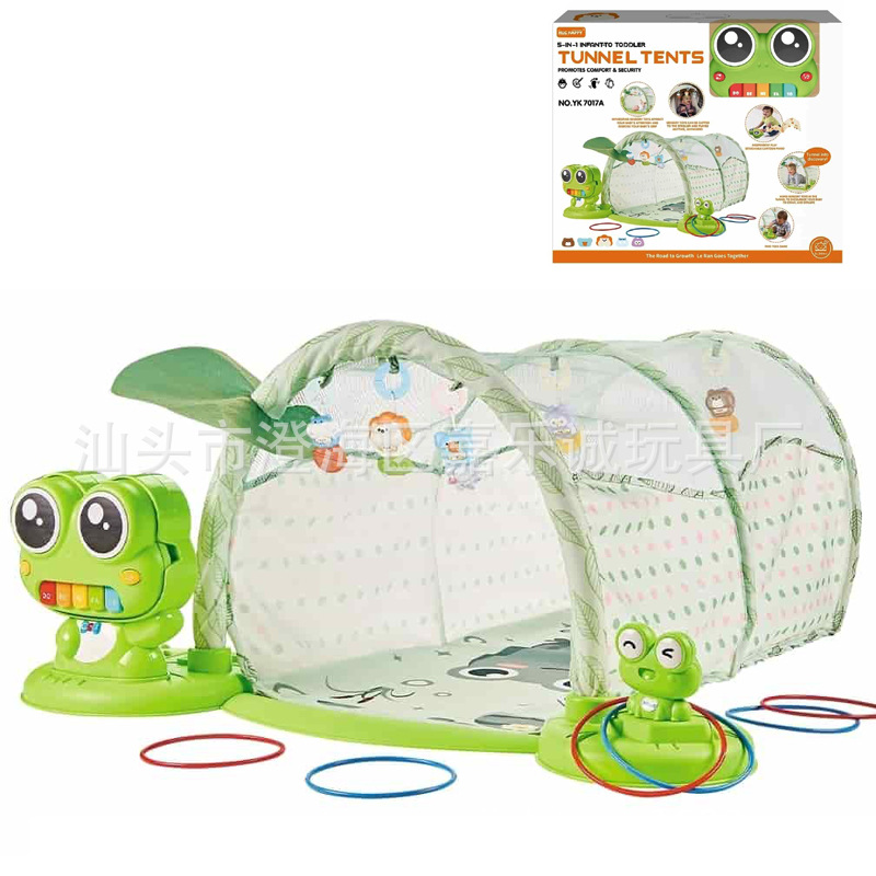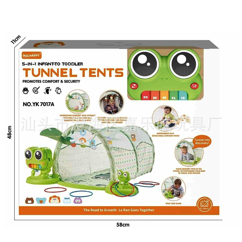 产品功能:1.一款青蛙琴+帐篷爬行通道玩具。2.清新可爱的青蛙荷叶外观,优质环保柔软卡通图案的帐篷爬行通道,带防撞条。3.配置一只青蛙琴鼓,鼓琴结合的卡通外观,大眼睛鼓面,5音配彩虹色按键,能切换钢琴、小号、动物声等多种声效,还有多首旋律和DJ模式,长按大眼睛还有鼓曲。4.还有套圈模式,提供更多玩法。5.5款色彩鲜艳,造型各异的公仔吊件。