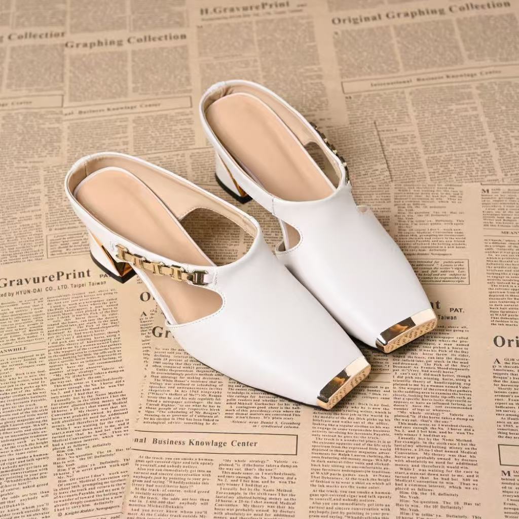 여성용 메탈 아이 헤드 여름 신상 스퀘어 토 하프 슬리퍼, 미드 힐, 부드러운 가죽, 캐주얼, 게으른 슬립온, 토캡 슬리퍼스토어 가기