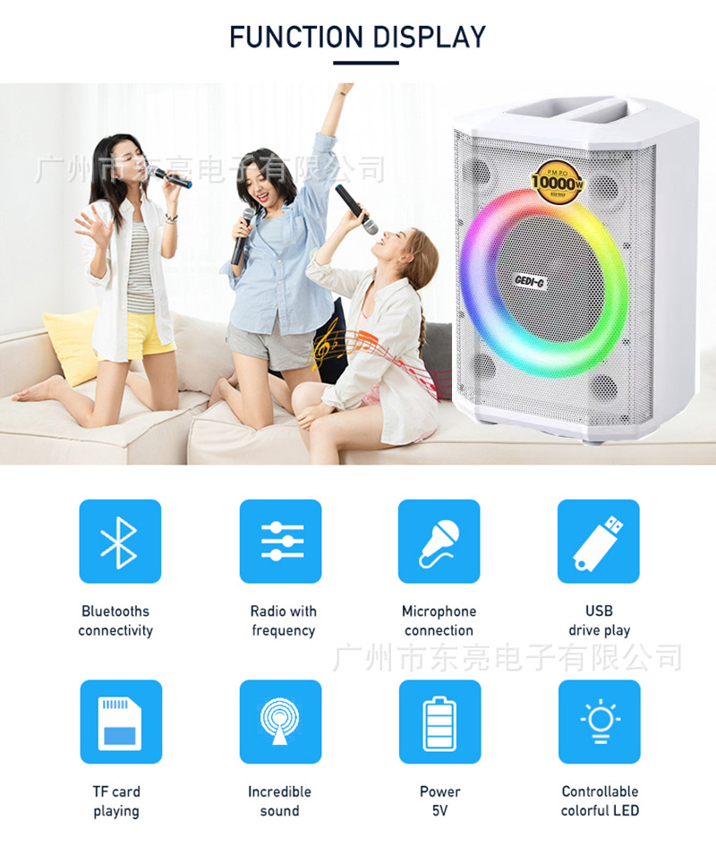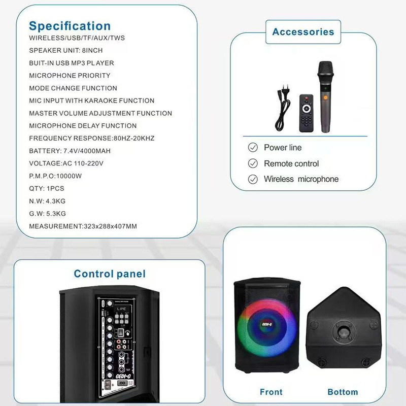 功能:蓝牙,收音机,U盘,TF卡,AUX音频,MIC*2,GT,TREBLE,ECHO,BASS,遥控器,无线麦克风