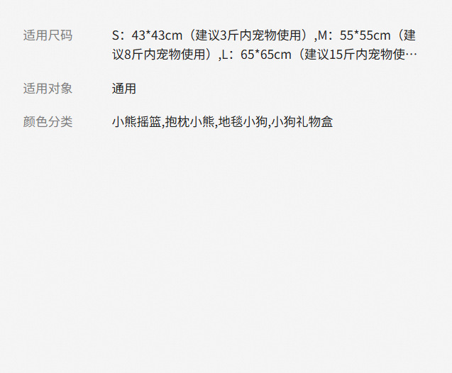 • L: 65*65cm(7.5kg세 미만의 애완동물에게 권장)