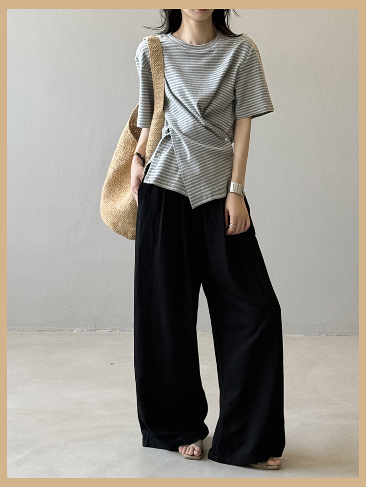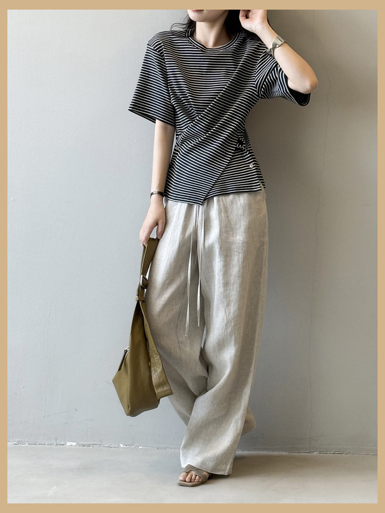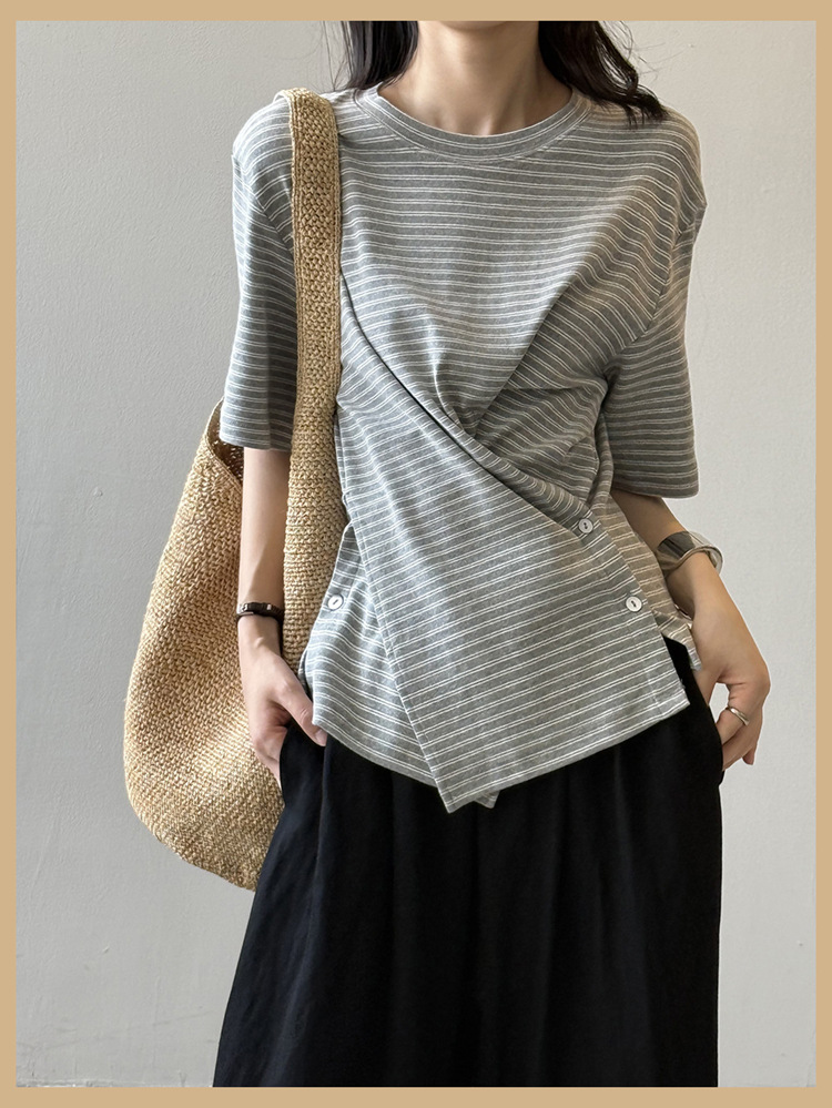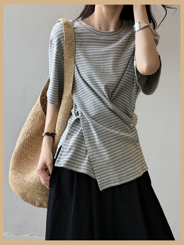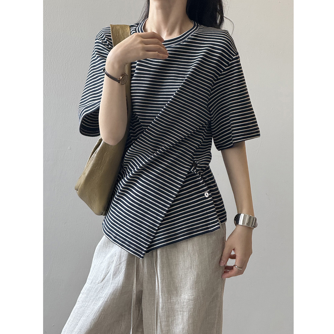 예쁜 핀치 웨이스트 탑, 디자인 니치 스트라이프 티셔츠, 여성용 반팔 웨이스트 슬리밍 및 연령 감소 탑, 반팔 화이트 매치스토어 가기