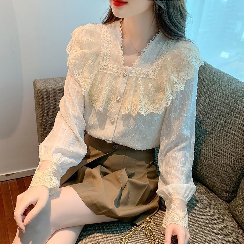여성용 레이스 셔츠 2025 봄 여름 신상 레이스 셔츠 쉬폰 셔츠, 패셔너블한 여성용 상의, 배를 커버하고 날씬해 보이는 여성용 셔츠