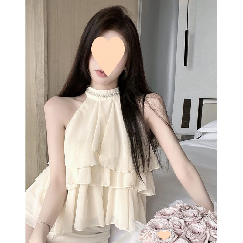 荷叶边挂脖雪纺衫女装2024夏季新款设计感重工镶钻露肩无袖上衣潮
