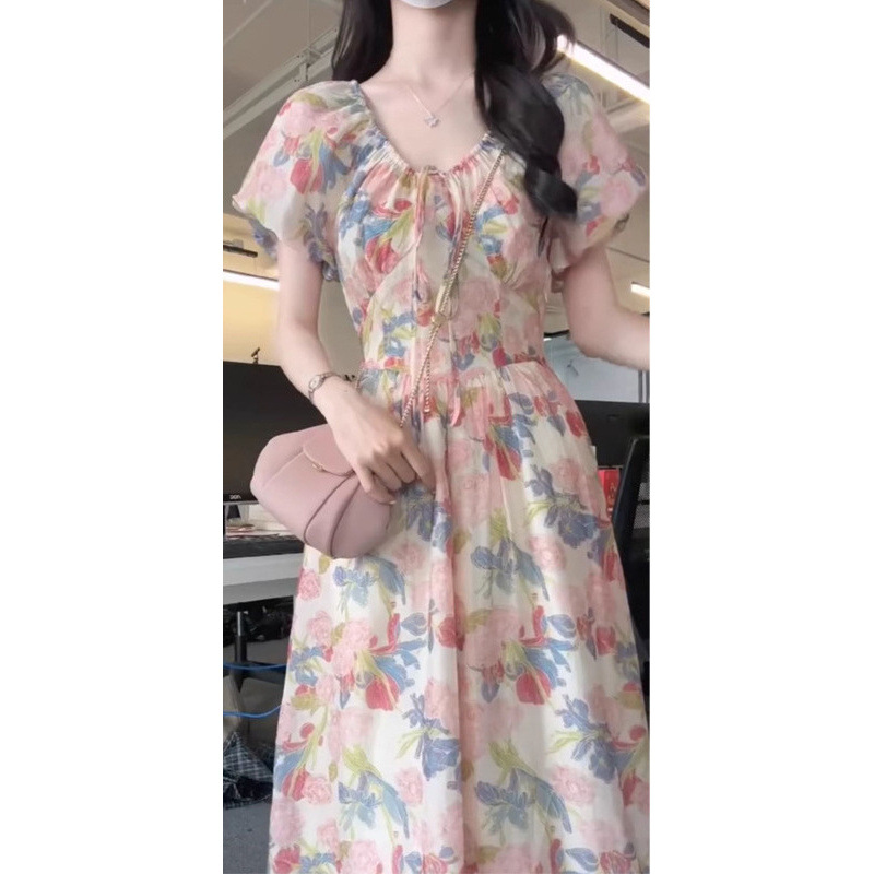 티 브레이크 프렌치 퍼프 슬리브 꽃무늬 드레스 여성 여름 2025 새로운 스타일 부드러운 스타일 슈퍼 멋진 허리 기질 롱 스커트스토어 가기