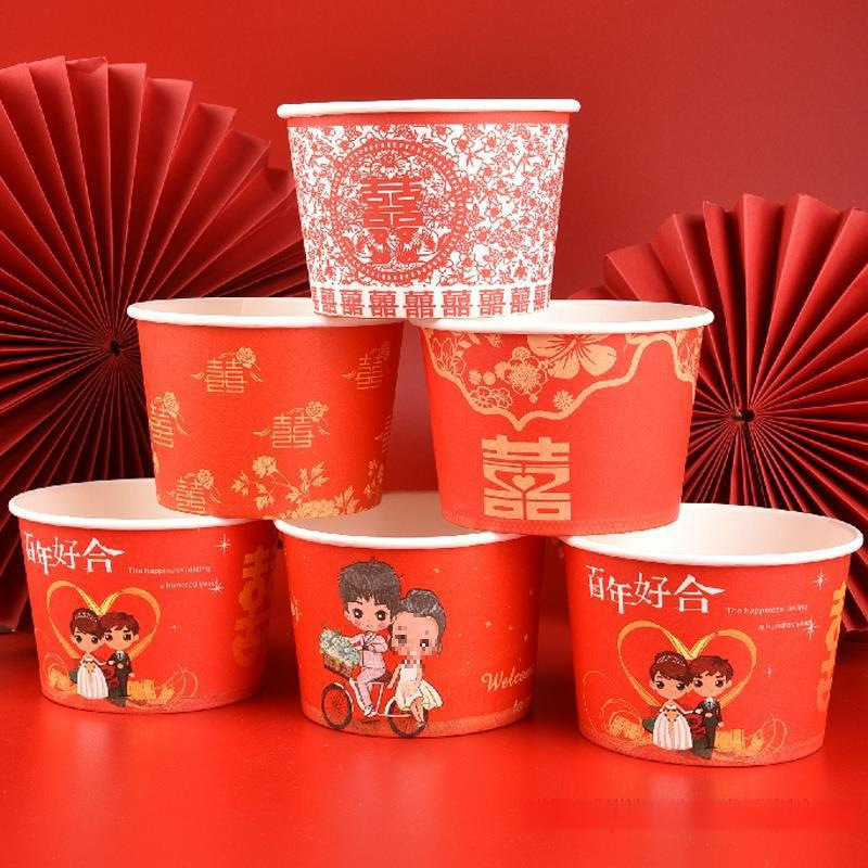 결혼식 일회용 빨간 종이 그릇 두꺼운 결혼식 그릇 결혼식 연회 연회 축제 종이 컵 그릇과 젓가락 세트 결혼식을위한스토어 가기