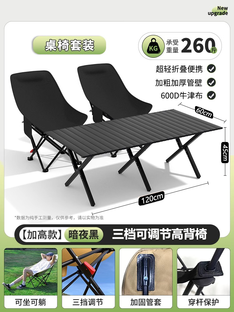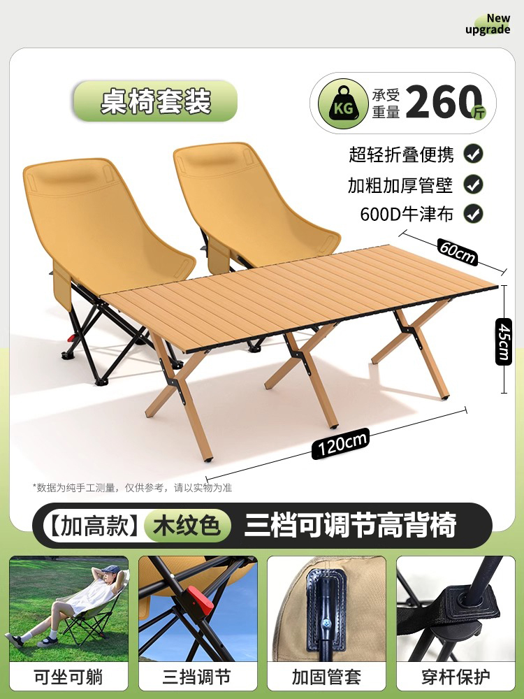 • "테이블과 의자 세트" 탄소강 대형 나뭇결 테이블 + [3단 조절 가능] 카키색 의자 2개"