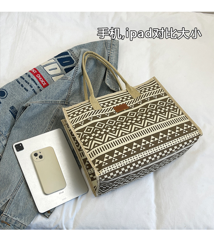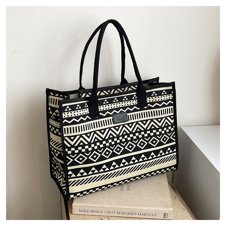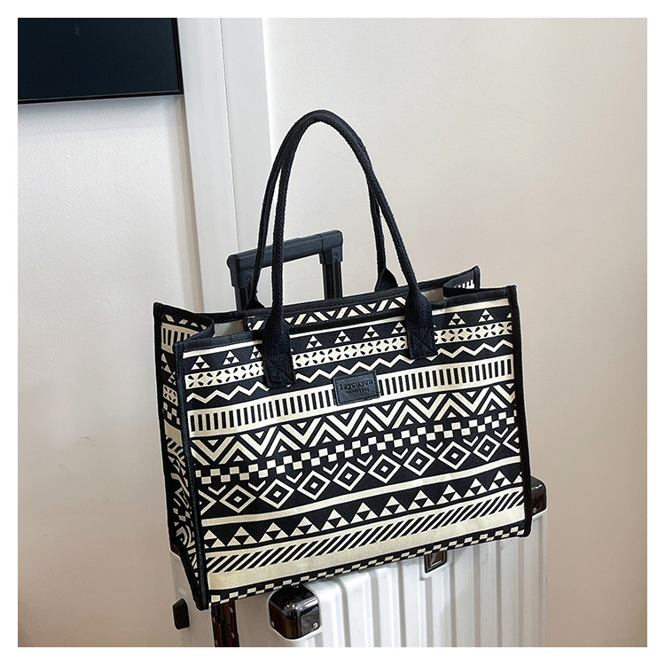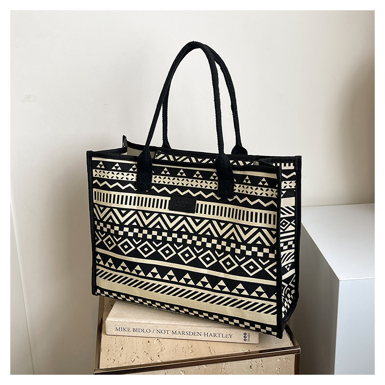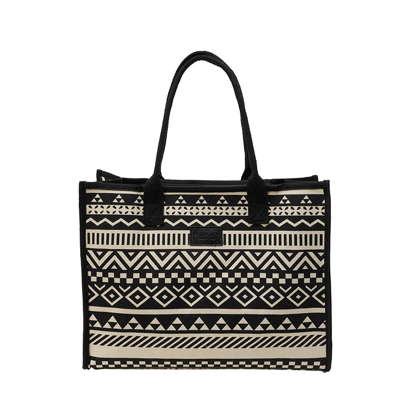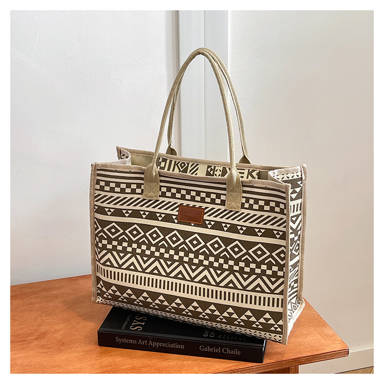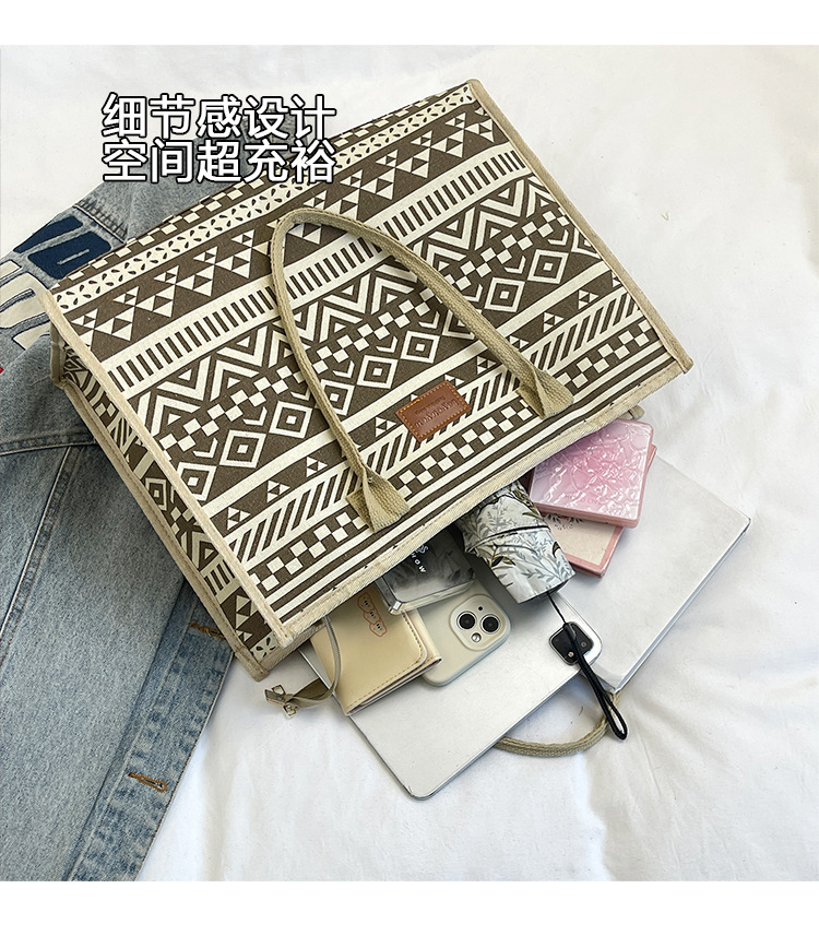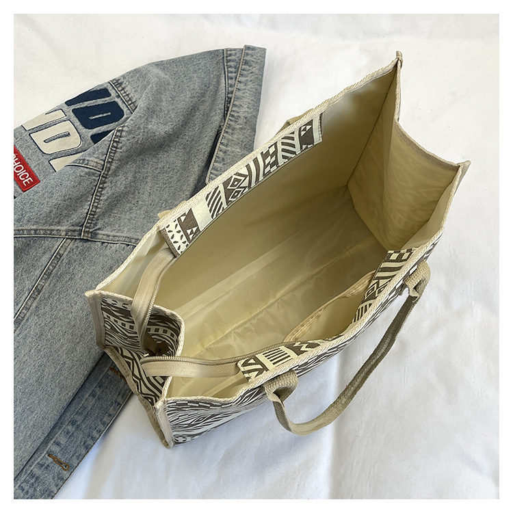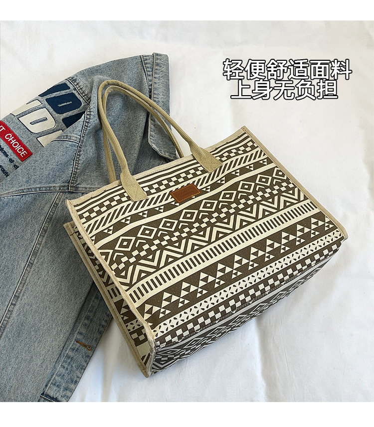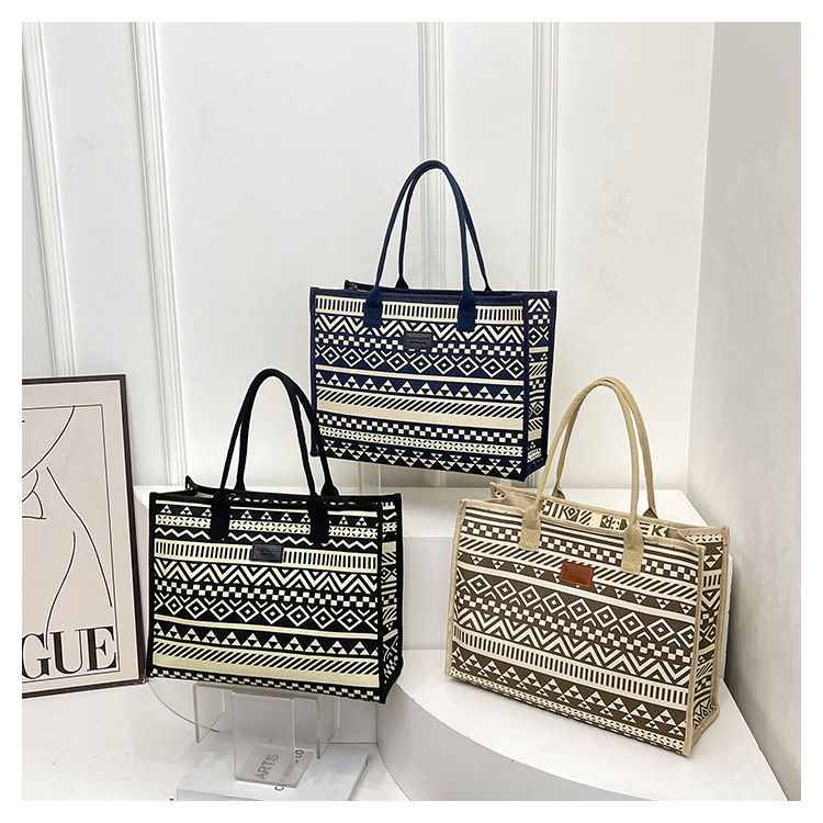 캔버스 에스닉 스타일 대용량 토트 백 2025 새로운 두꺼운 지퍼 숄더 백 통근 휴대용 쇼핑백