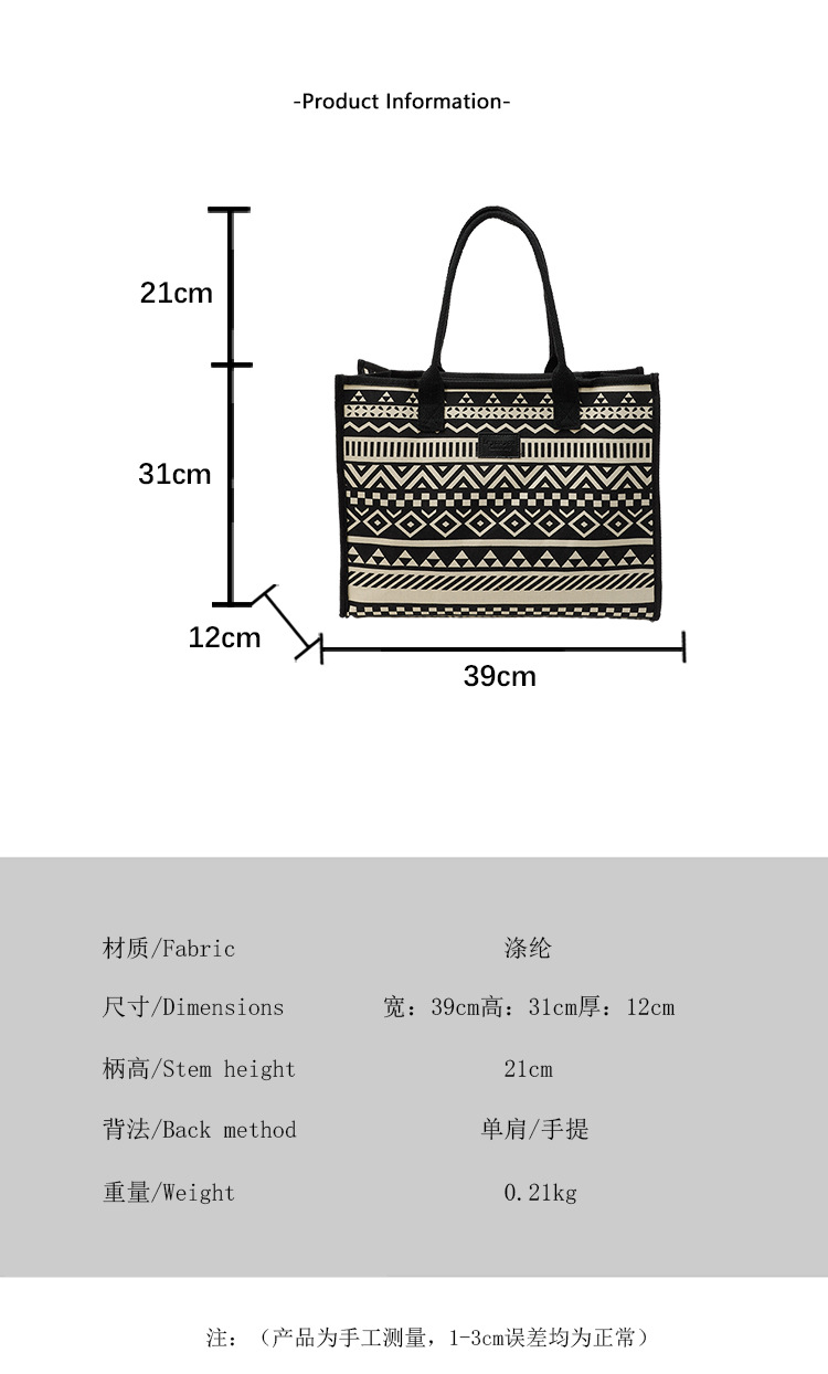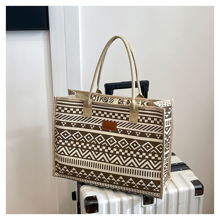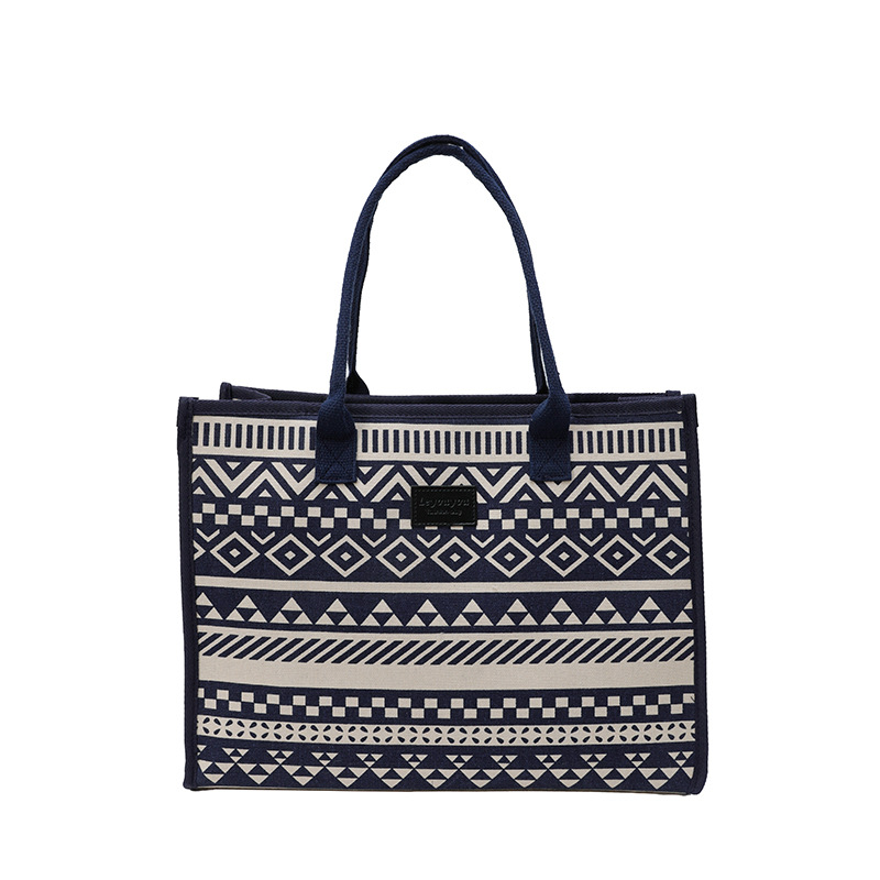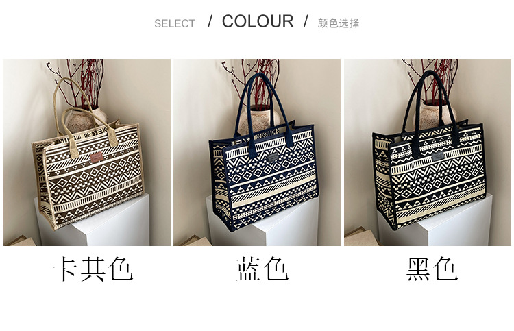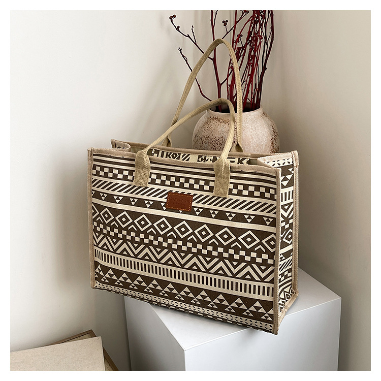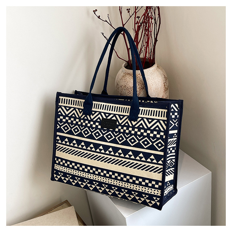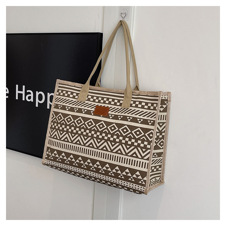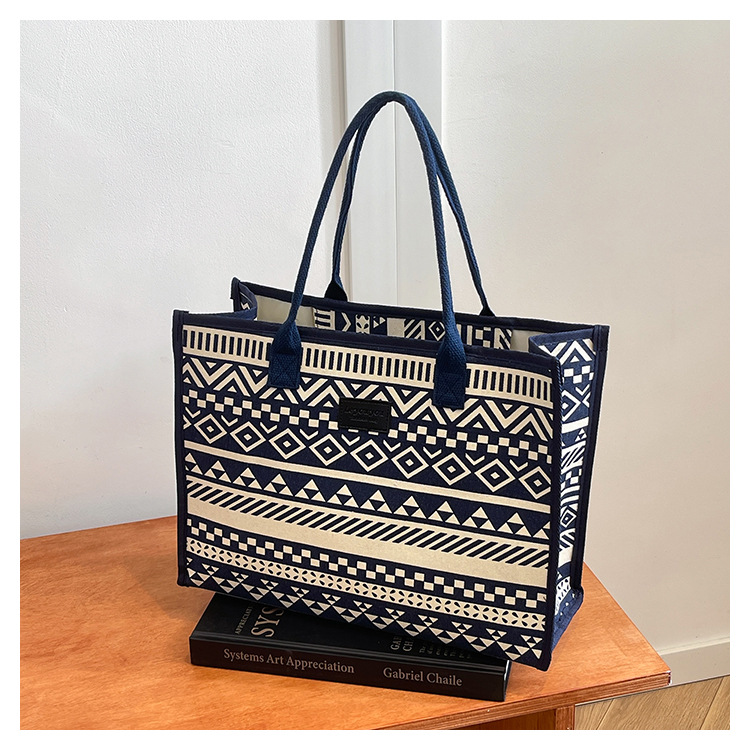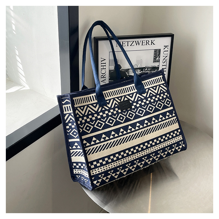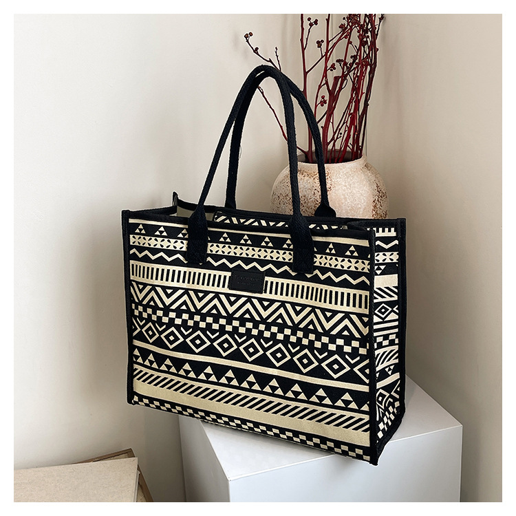 캔버스 에스닉 스타일 대용량 토트 백 2025 새로운 두꺼운 지퍼 숄더 백 통근 휴대용 쇼핑백