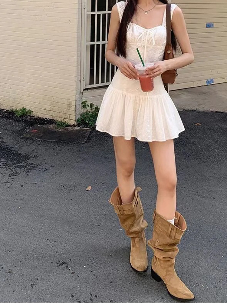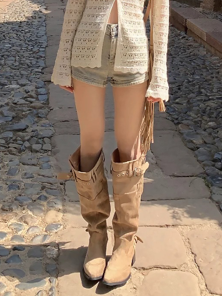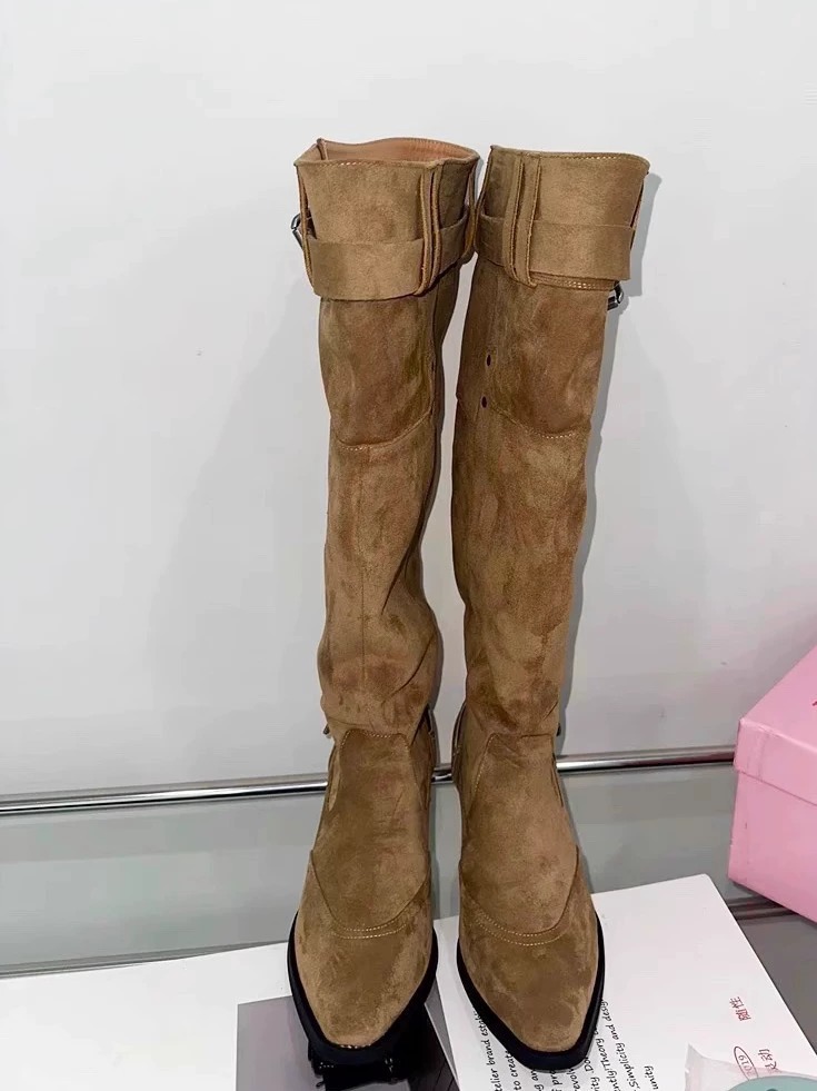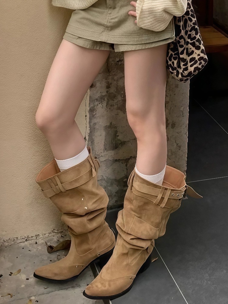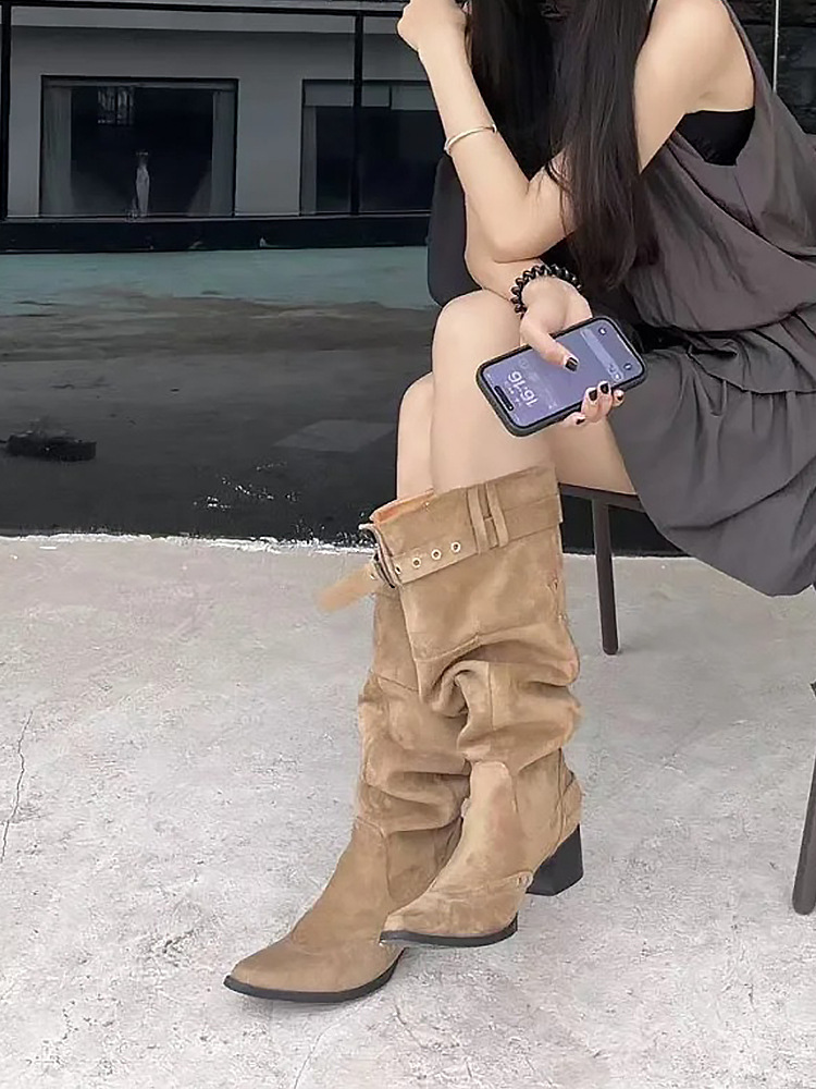 레트로 메일라드 부츠, 빅 튜브, 슬리밍 플리츠 스택 부츠, 여성 여름 포인티드 토 두꺼운 굽 카키 부츠스토어 가기