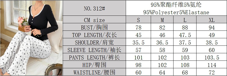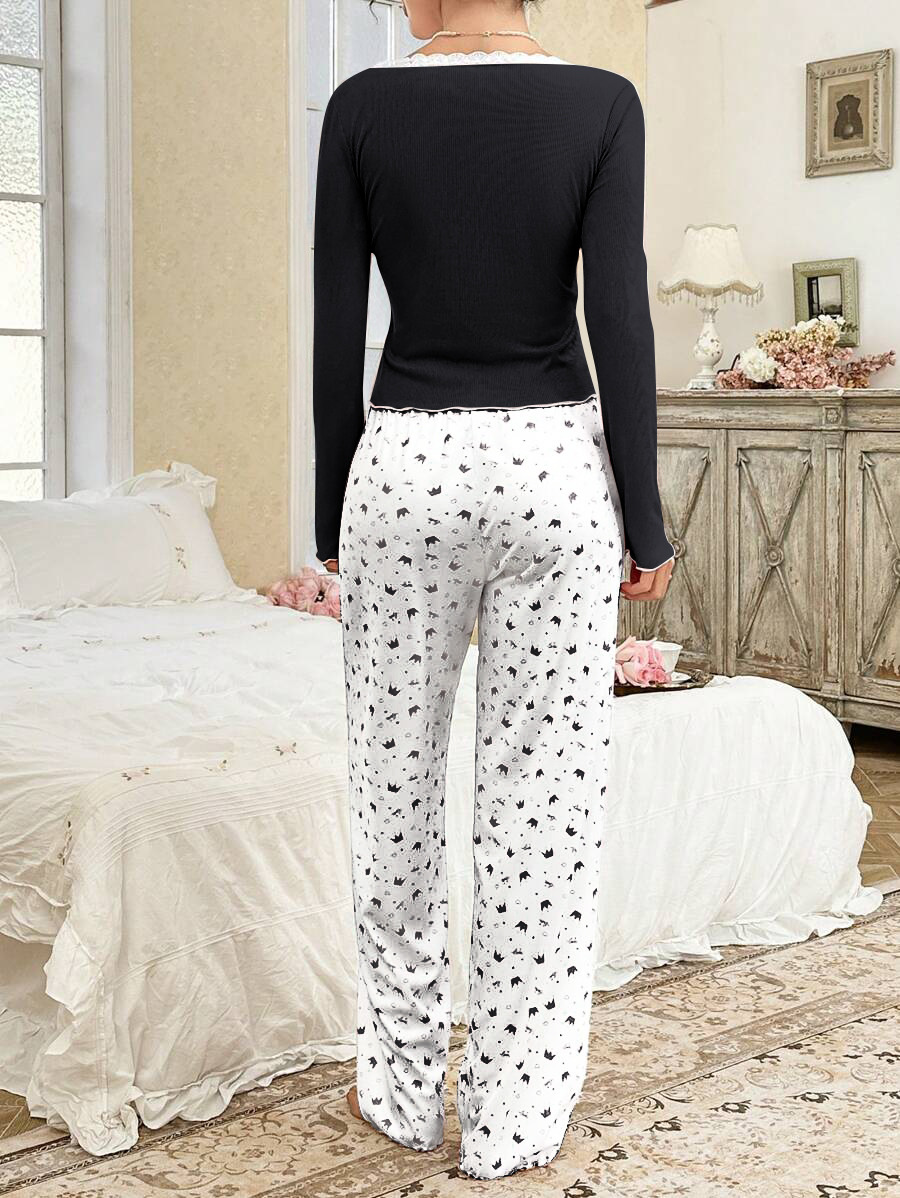국경 간 대외 무역 유럽과 미국 여성 잠옷 편안한 프린트 레이스 스플 라이스 버튼 긴팔 바지 홈웨어 세트스토어 가기