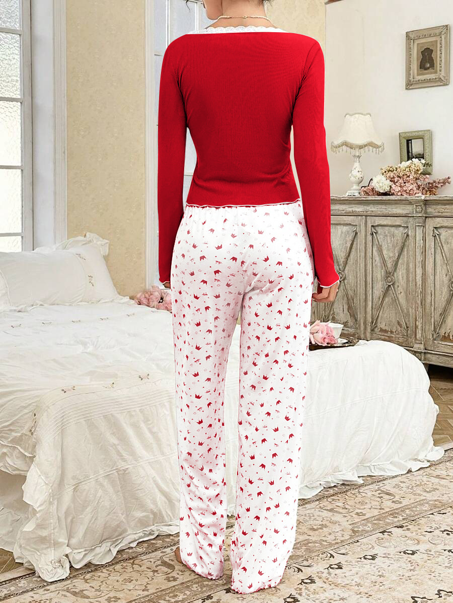 국경 간 대외 무역 유럽과 미국 여성 잠옷 편안한 프린트 레이스 스플 라이스 버튼 긴팔 바지 홈웨어 세트