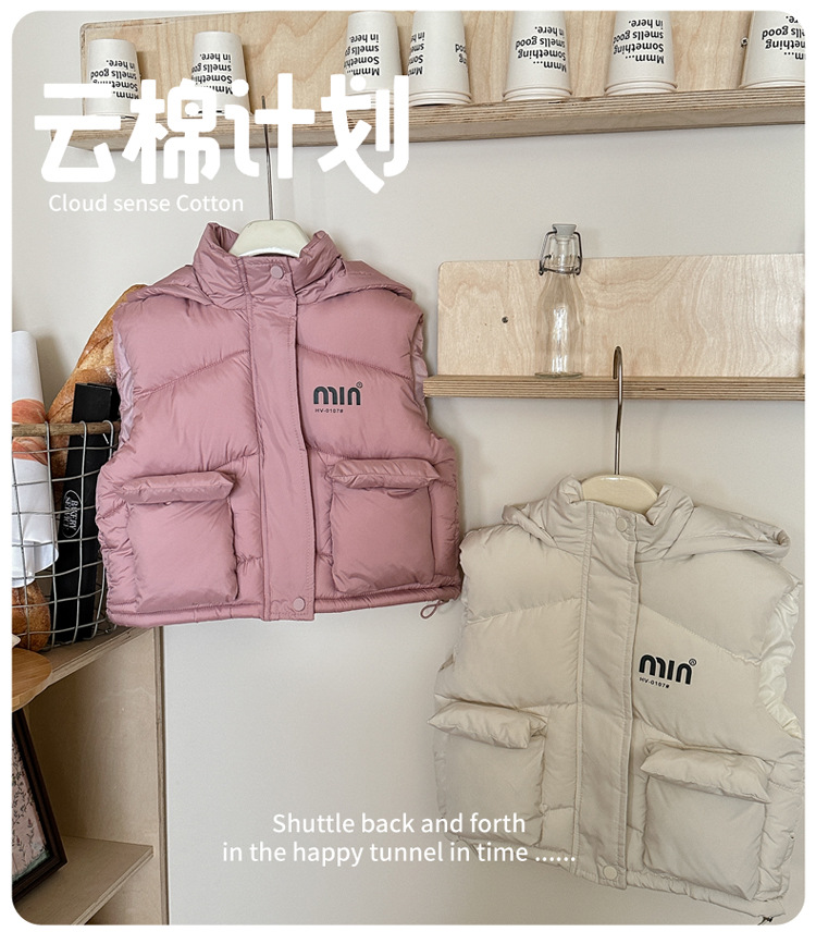 국경 간 어린이 다운 코튼 조끼 2025 가을, 겨울 소년과 소녀 짧은 두꺼운 따뜻한 양복 조끼 서양식 후드 조끼