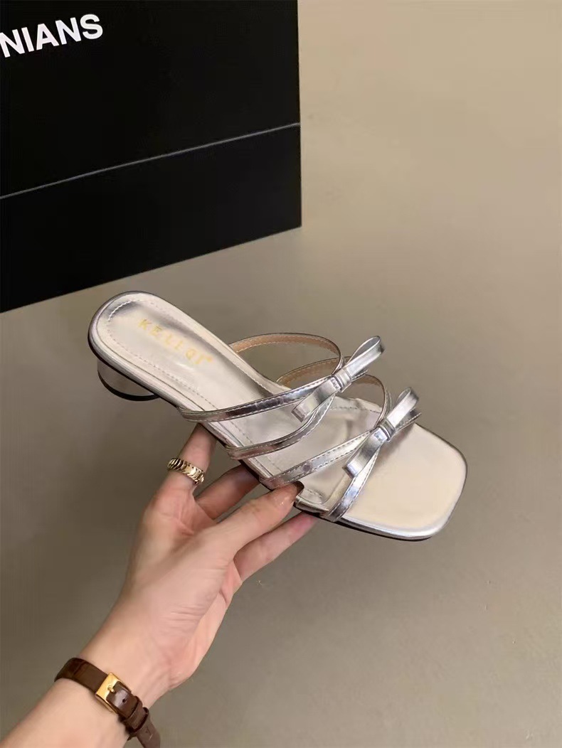 여성용 샌들 2025 새로운 여름 아우터웨어 다용도 틈새 고급 패션 보우 두꺼운 굽 실버 하이힐 슬리퍼스토어 가기