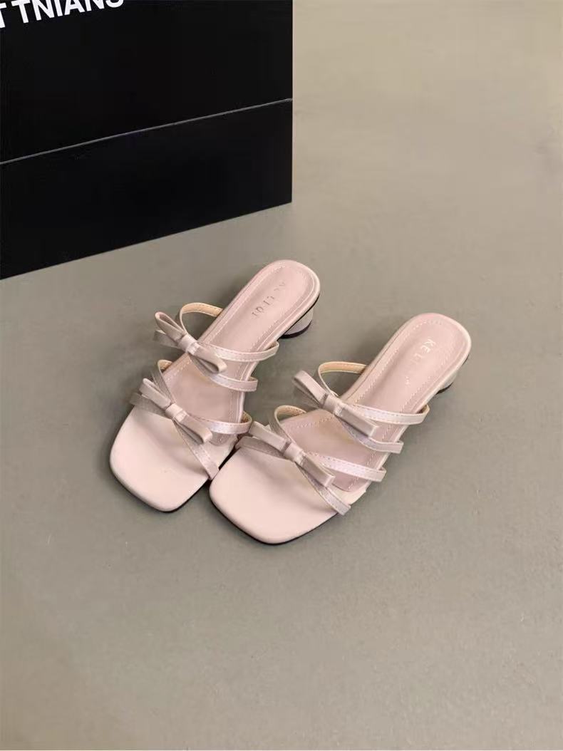 여성용 샌들 2025 새로운 여름 아우터웨어 다용도 틈새 고급 패션 보우 두꺼운 굽 실버 하이힐 슬리퍼
