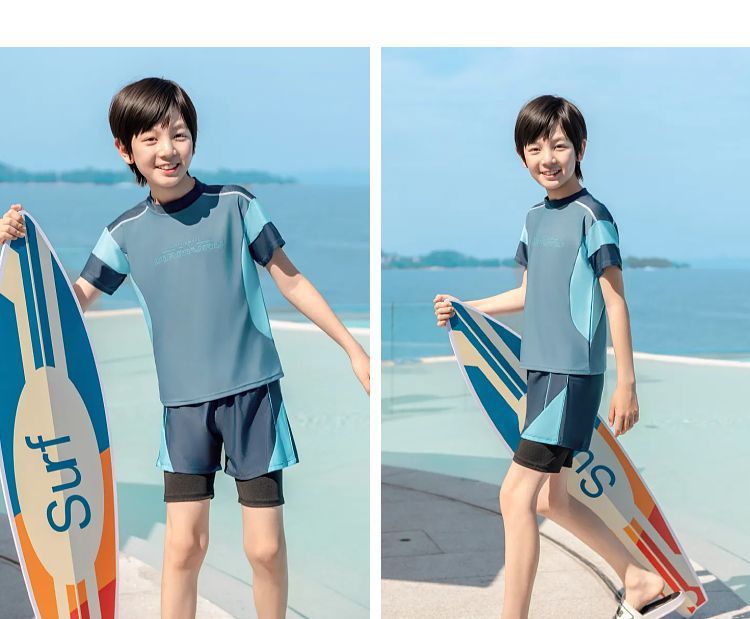 아동 수영복 소년 스플릿 수영 트렁크 2025 큰 어린이 및 청소년 소년 수영을위한 새로운 반팔 자외선 차단제 슈트스토어 가기