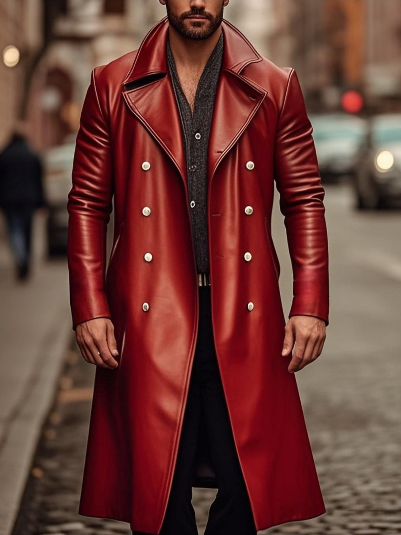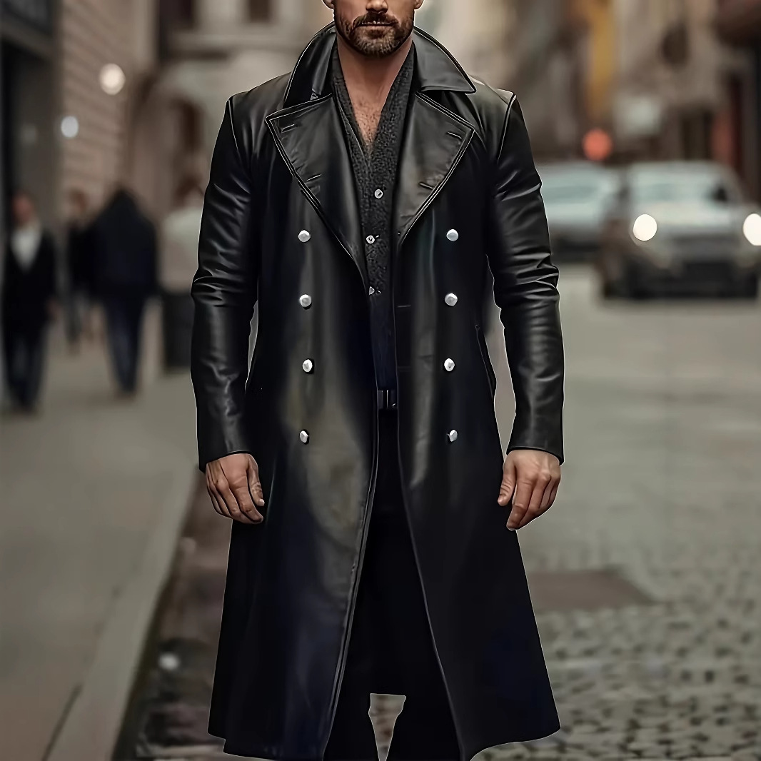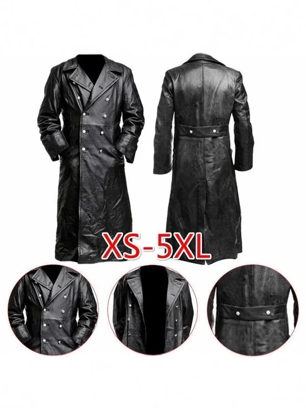 대외 무역 봄, 가을 남성 PU 가죽 자켓 유럽과 미국의 대형 중간 길이 가죽 윈드 브레이커 더블 브레스트 가죽 자켓 독일 군복스토어 가기