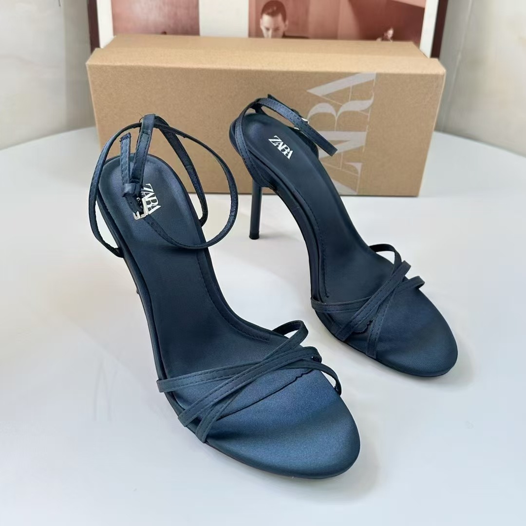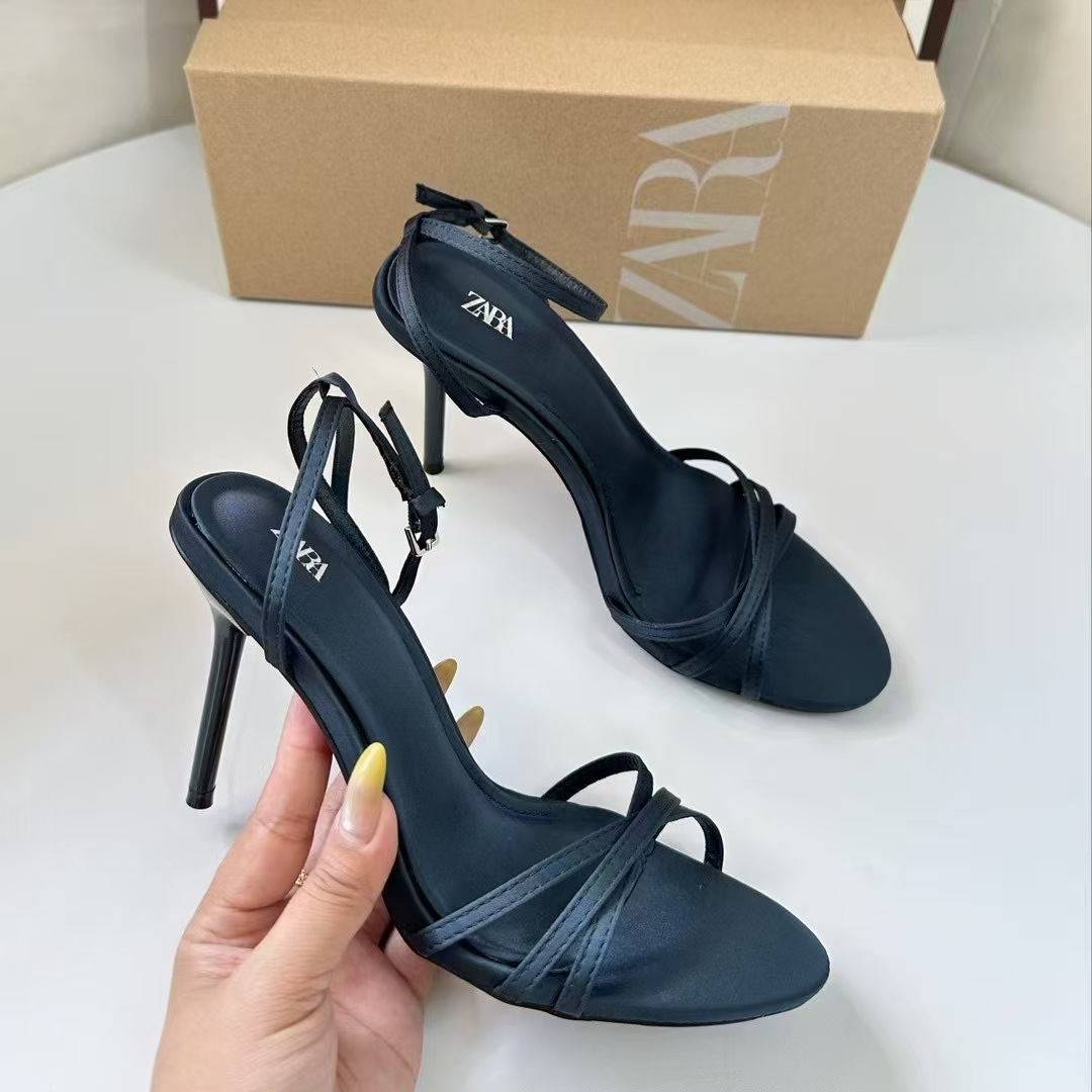 ZA 2025 새로운 프랑스 하이힐 여성 신발 뾰족한 발가락 얇은 스트랩 크로스 버클 패션 슬링 백 샌들 여성 공작 녹색스토어 가기