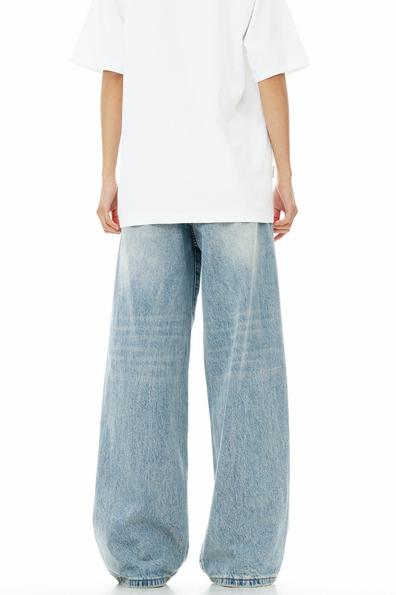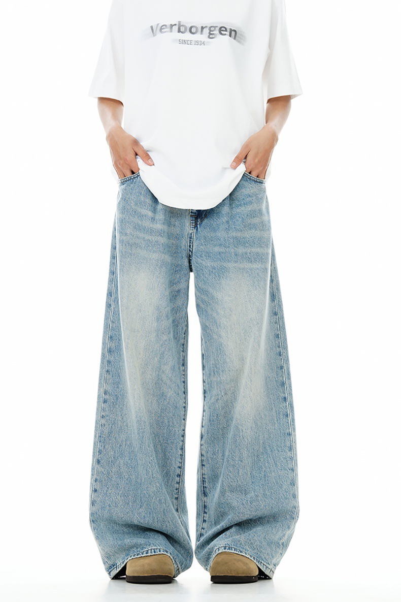 봄과 가을 새로운 라이트 블루 청바지 복고풍 워시 올드 스트레이트 루즈 와이드 레그 아메리칸 하이 스트리트 남성 바지스토어 가기