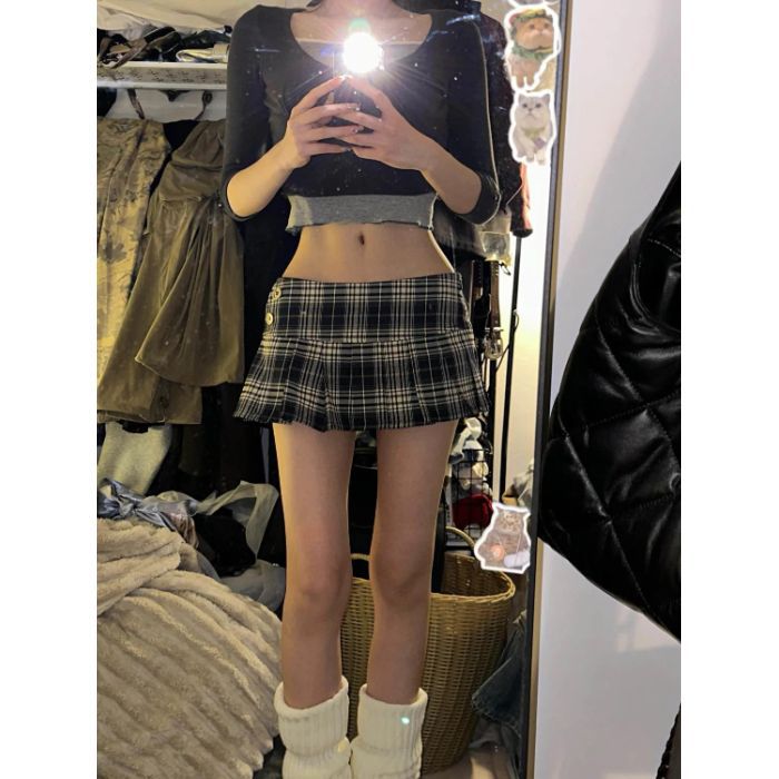 아메리칸 핫걸 로우 웨이스트 체크 무늬 스커트 여성용 봄 대학 스타일 패턴 JK 플리츠 스커트 슬리밍 A 라인 미니 스커트
