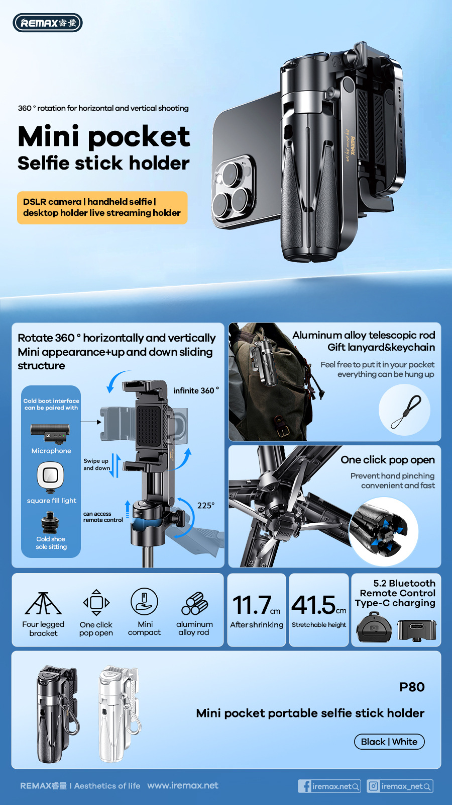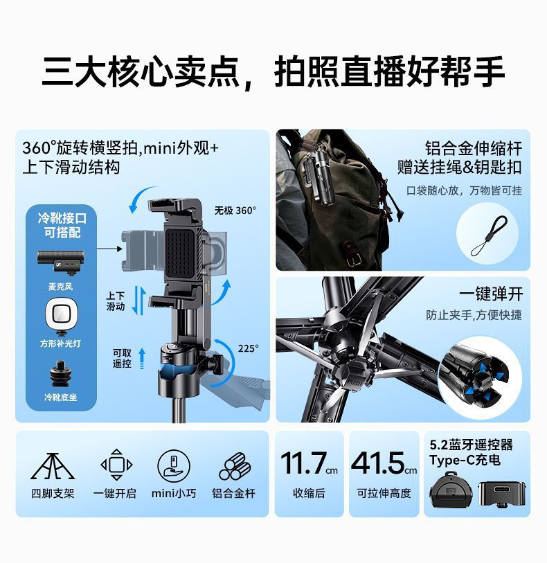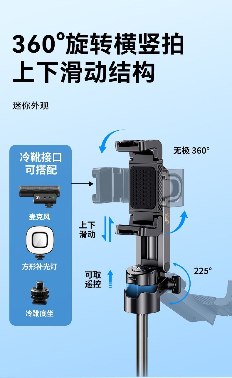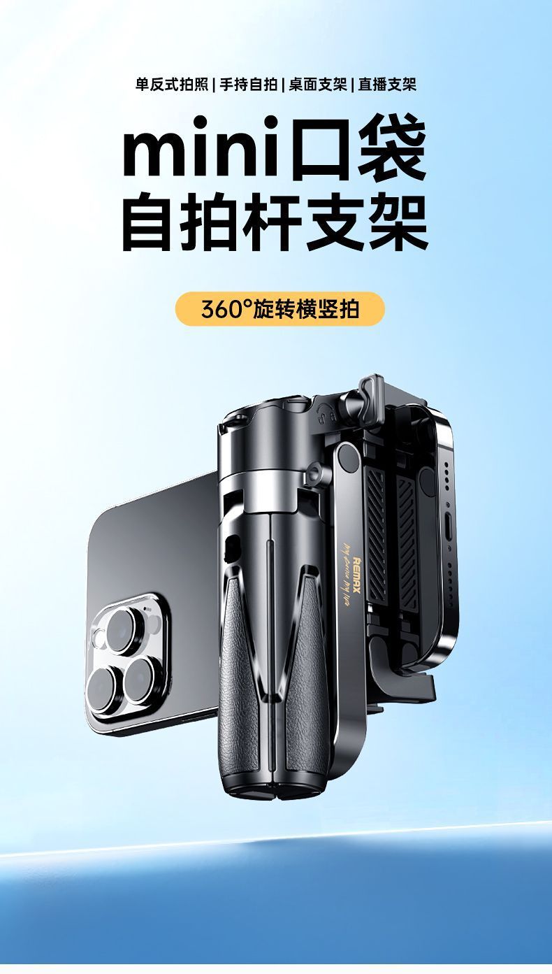 Remax 미니 블루투스 휴대 전화 셀카 스틱 홀더 야외 라이브 방송 삼각대 셀카 인공물 개폐식 및 접이식스토어 가기