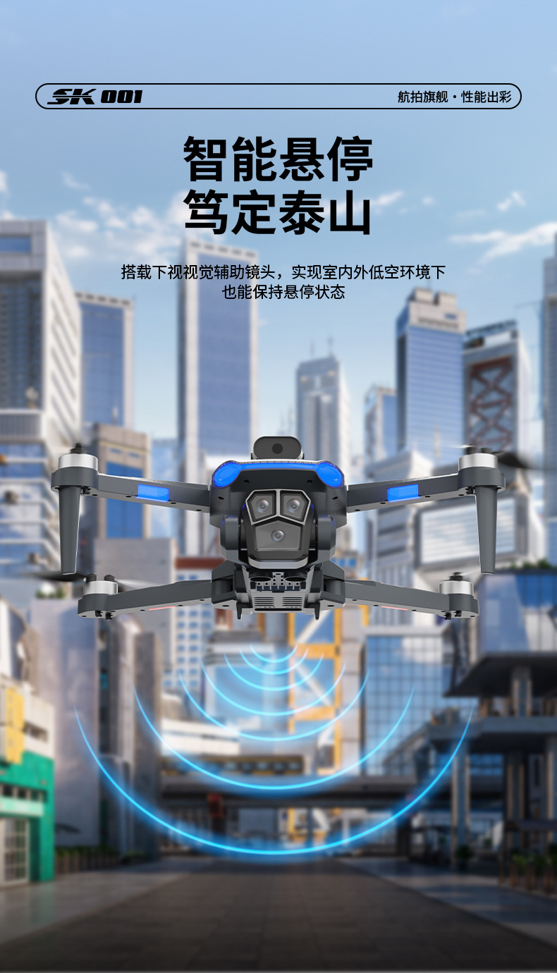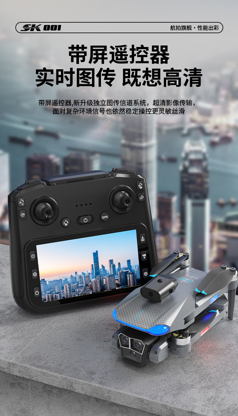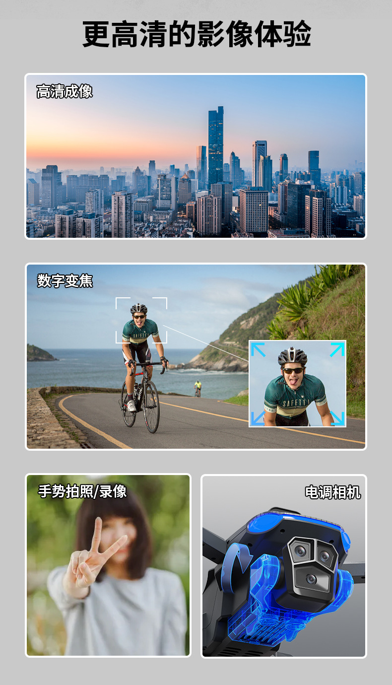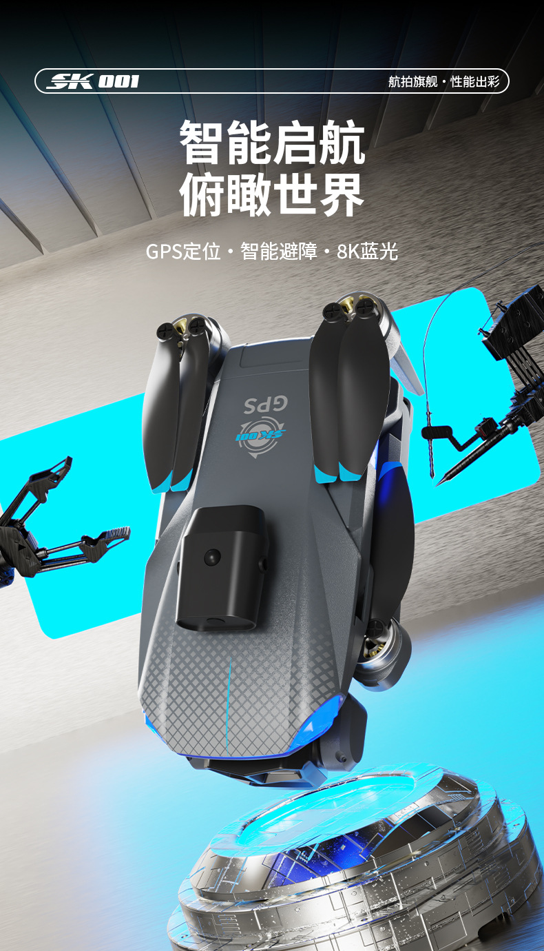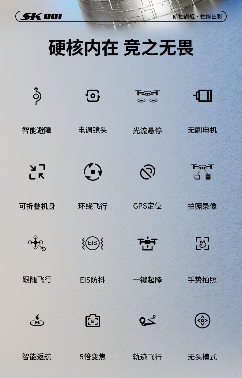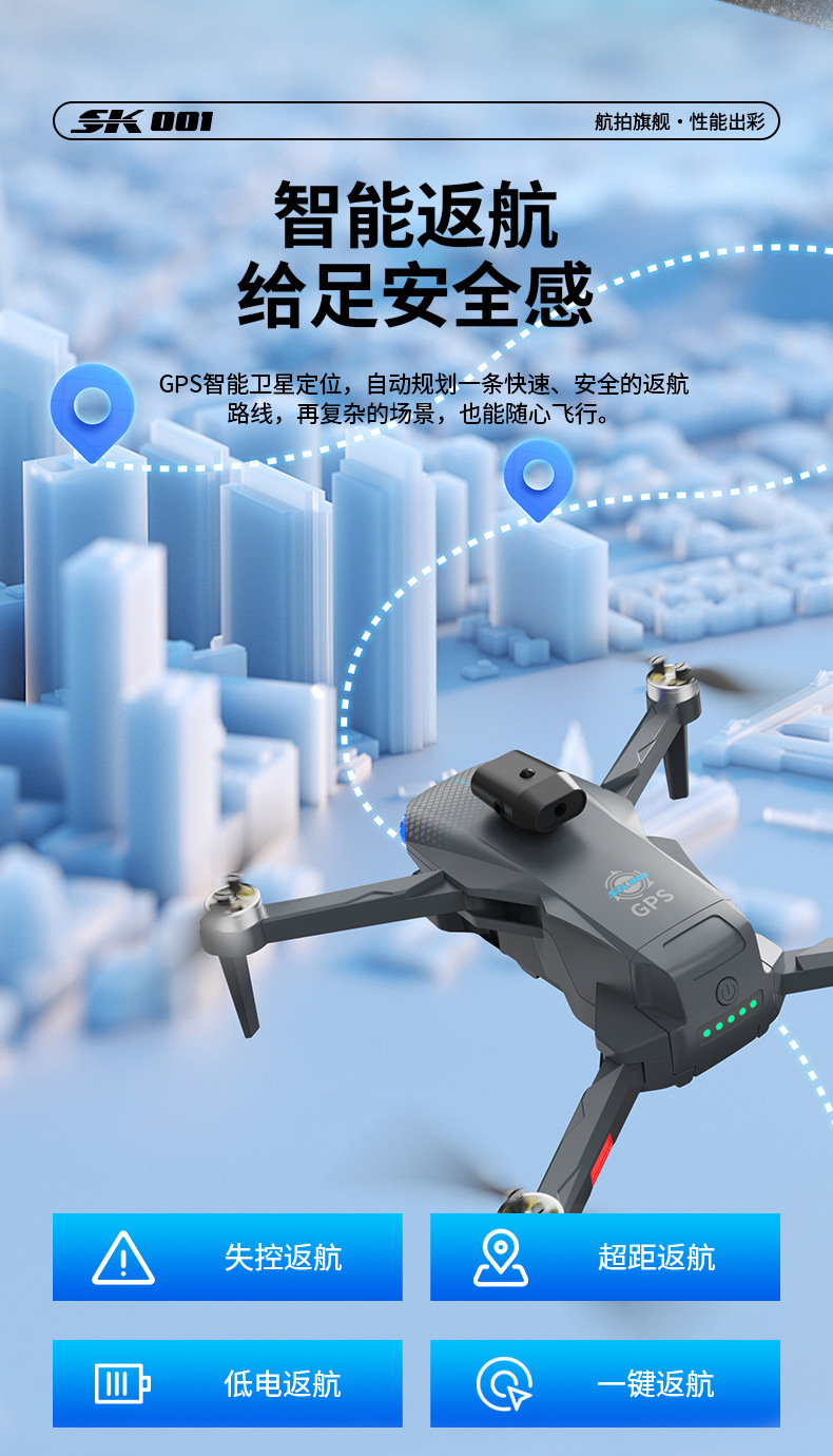 功能:遥控实时画面传输、四面避障、前进、后退、左转、右转、无头模式、一键返航、拍照/录像、一键起飞、一键降落、新手/高手模式、GPS模式,定高模式、GPS定位返航、电子围栏
