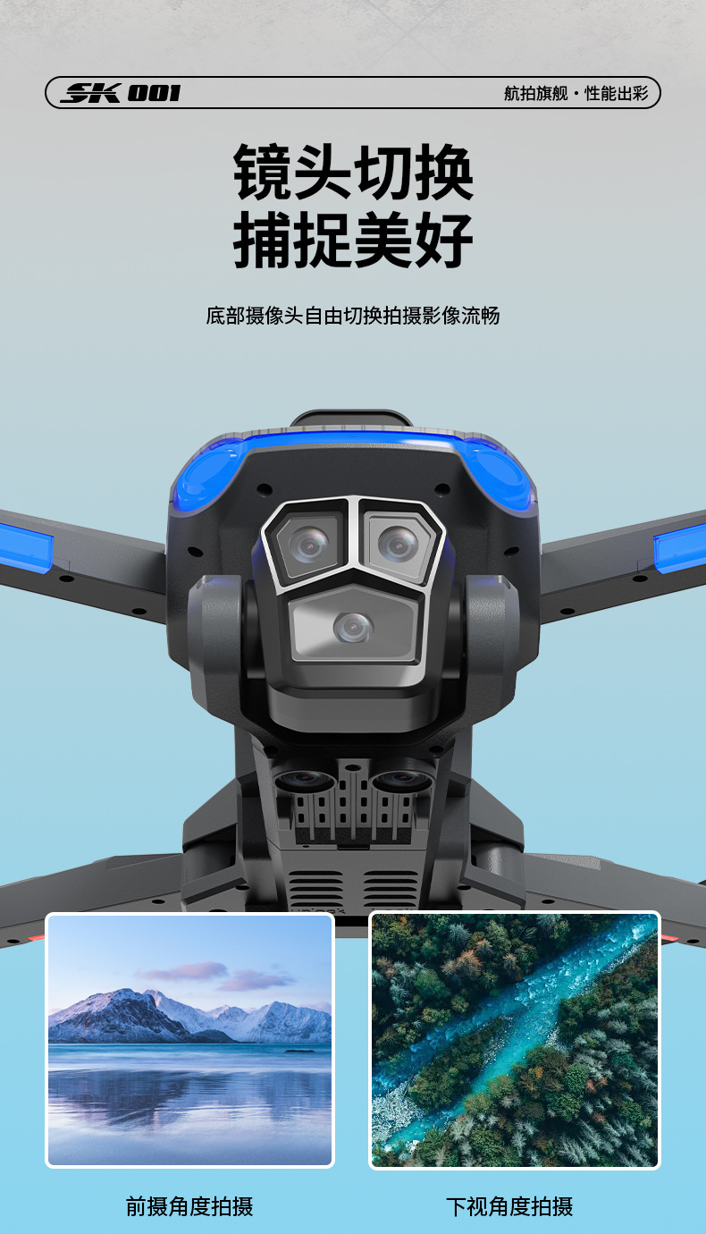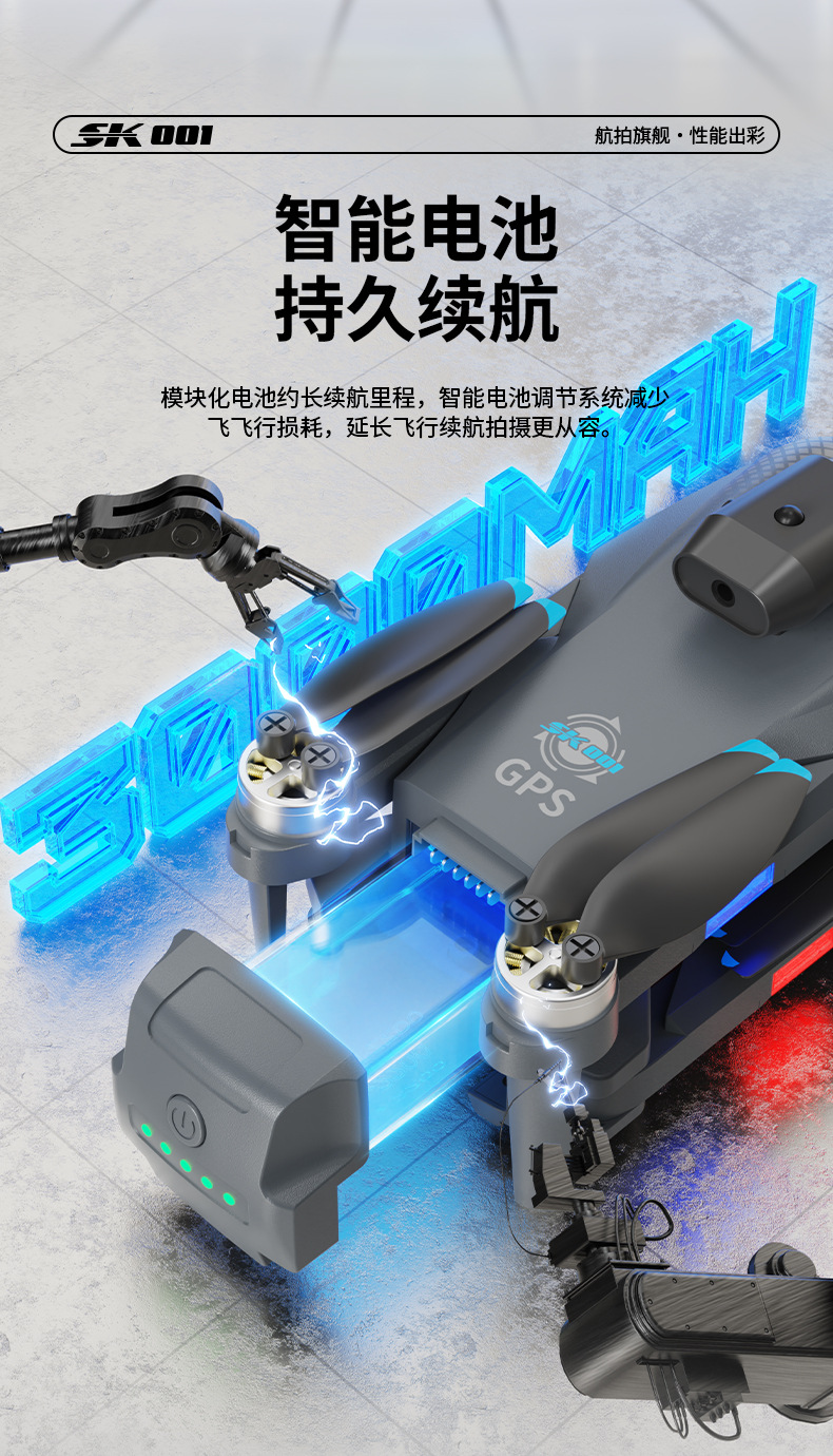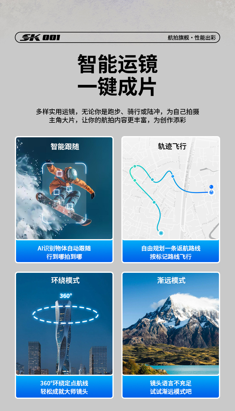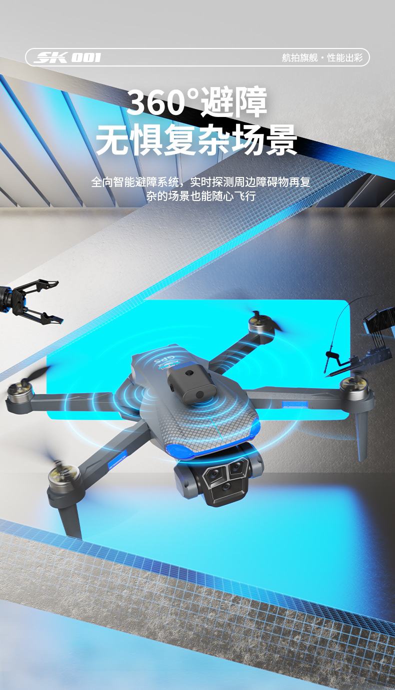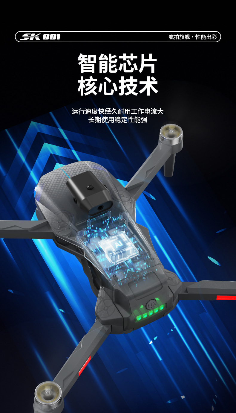 功能:遥控实时画面传输、四面避障、前进、后退、左转、右转、无头模式、一键返航、拍照/录像、一键起飞、一键降落、新手/高手模式、GPS模式,定高模式、GPS定位返航、电子围栏