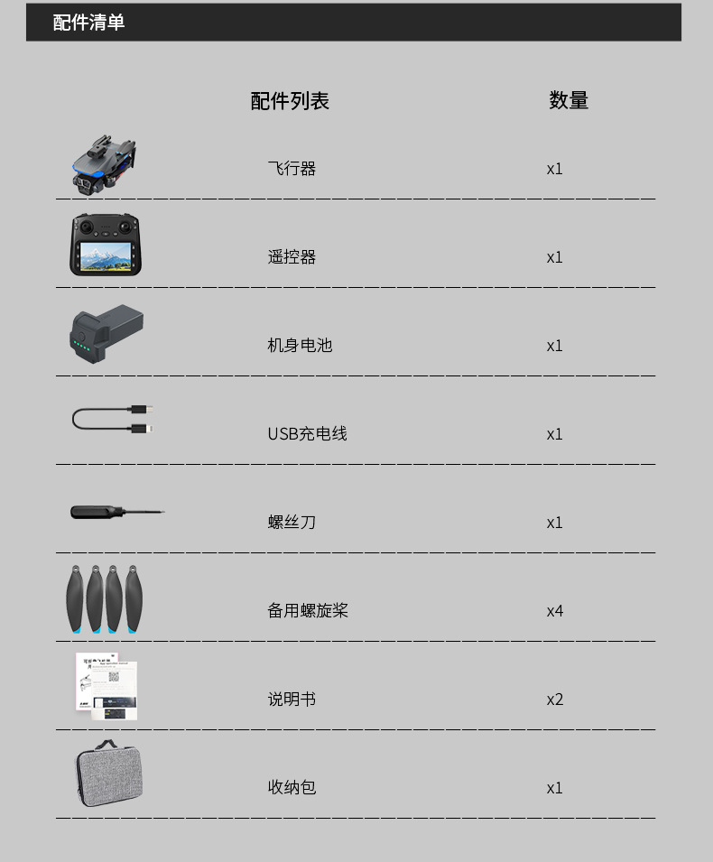 配置:飞行器*1 遥控器*1 USB线*2 保护罩*4 螺丝刀*1 备用风叶*4 无人机说明书*1 APP说明书*1