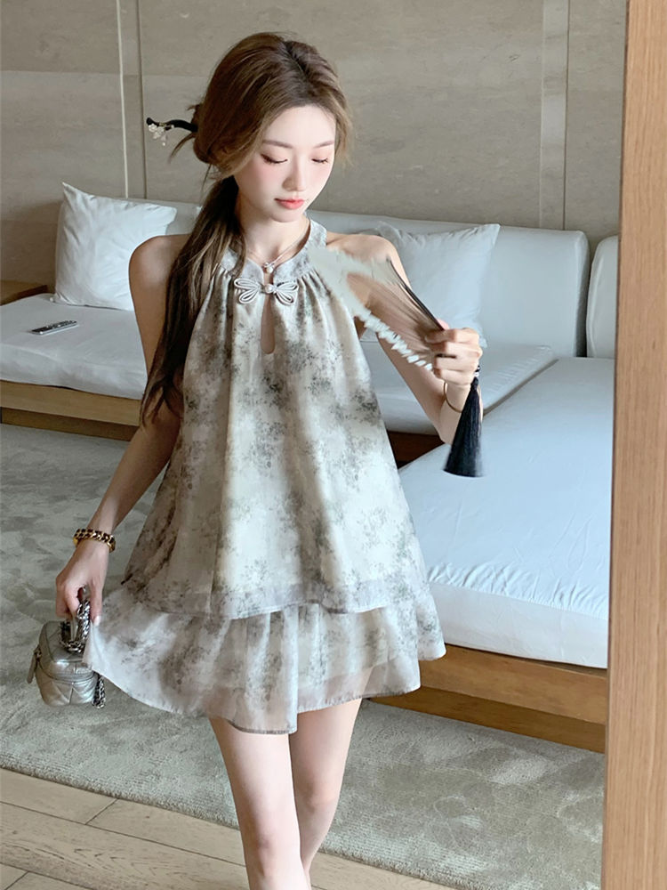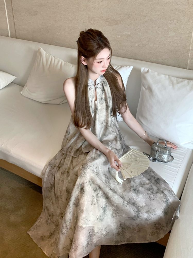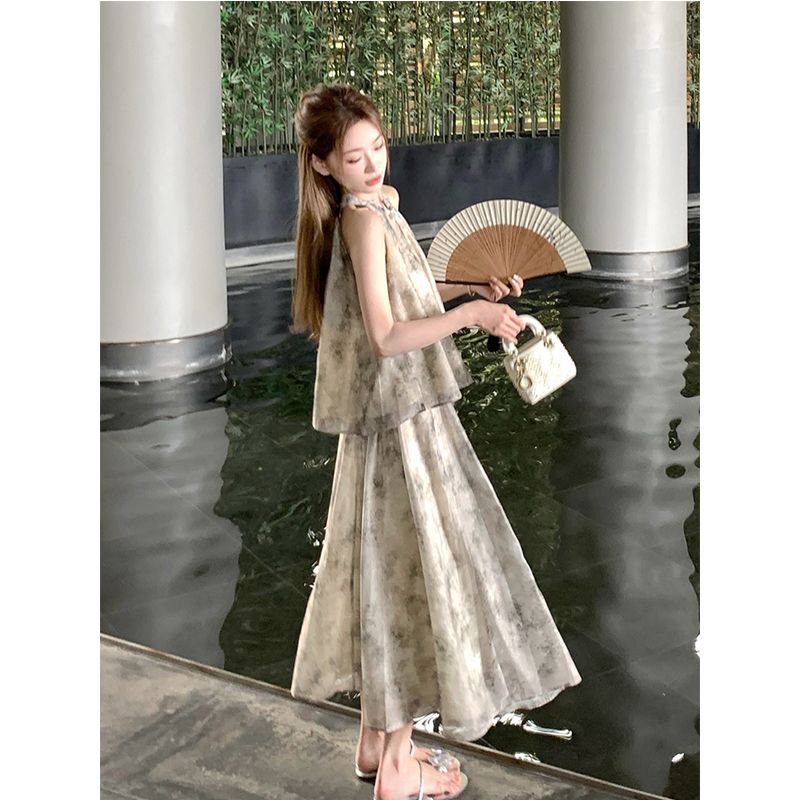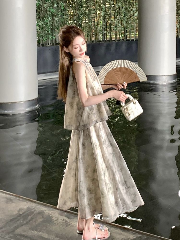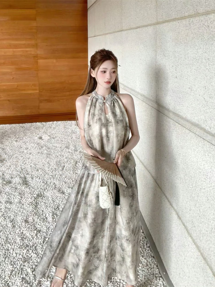 중국 스타일 민소매 홀터넥 탑 스커트 여성을위한 새로운 중국 스타일 정장 여름 통근 패션 느슨한 슬리밍 투피스 세트