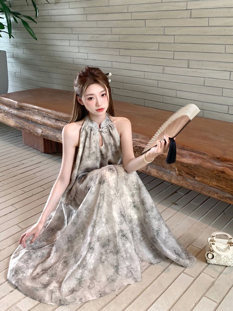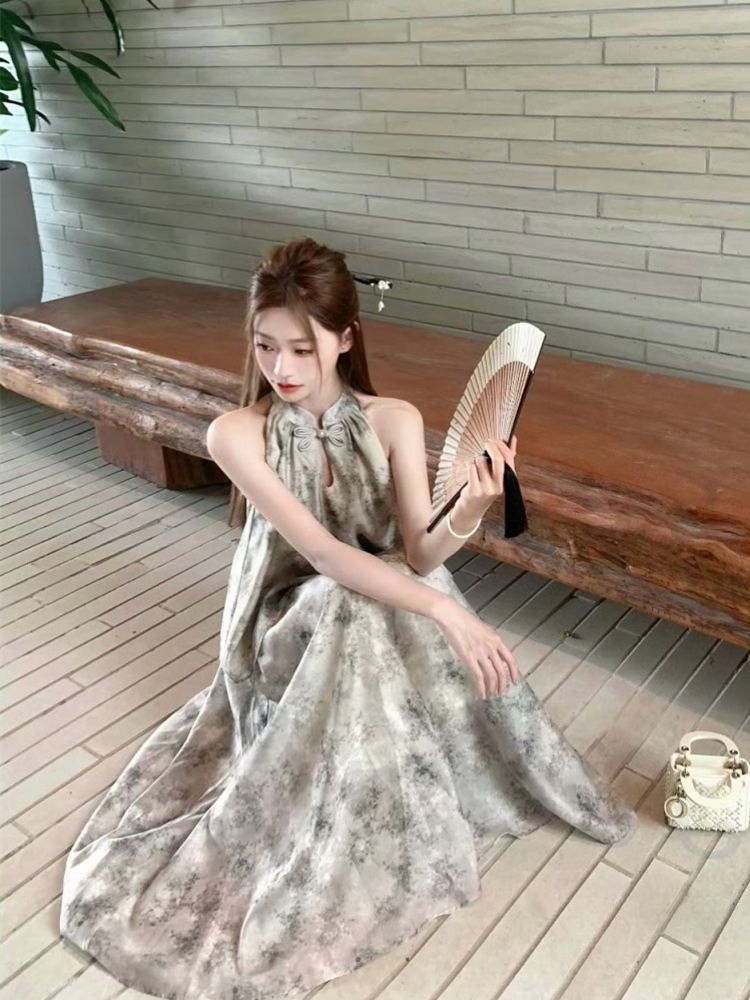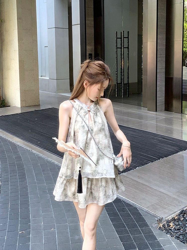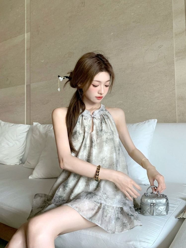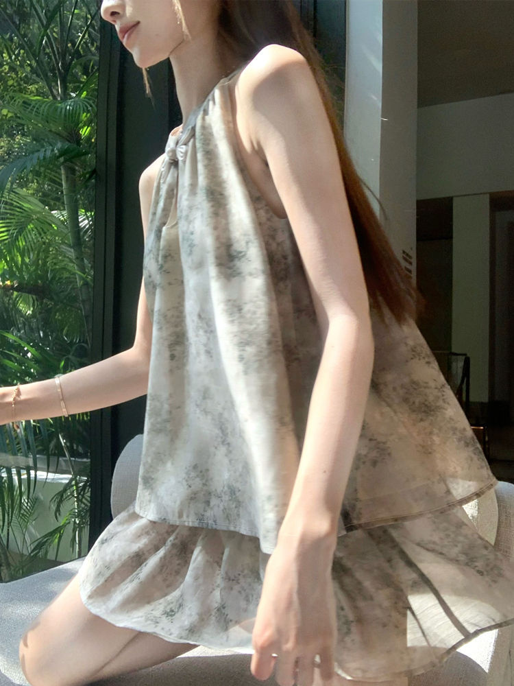 중국 스타일 민소매 홀터넥 탑 스커트 여성을위한 새로운 중국 스타일 정장 여름 통근 패션 느슨한 슬리밍 투피스 세트