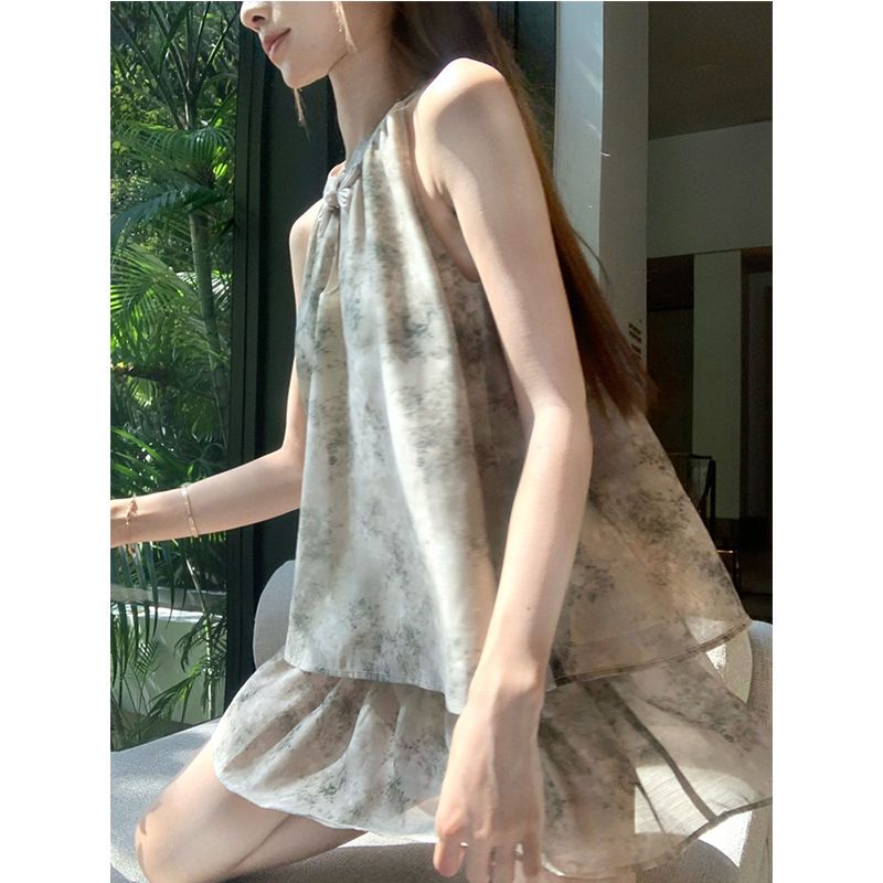 중국 스타일 민소매 홀터넥 탑 스커트 여성을위한 새로운 중국 스타일 정장 여름 통근 패션 느슨한 슬리밍 투피스 세트스토어 가기