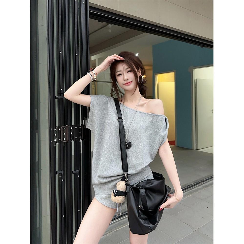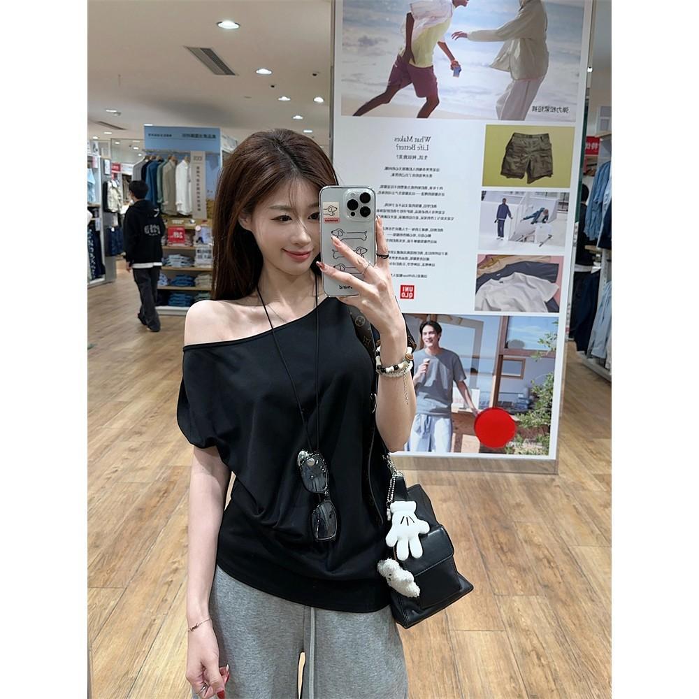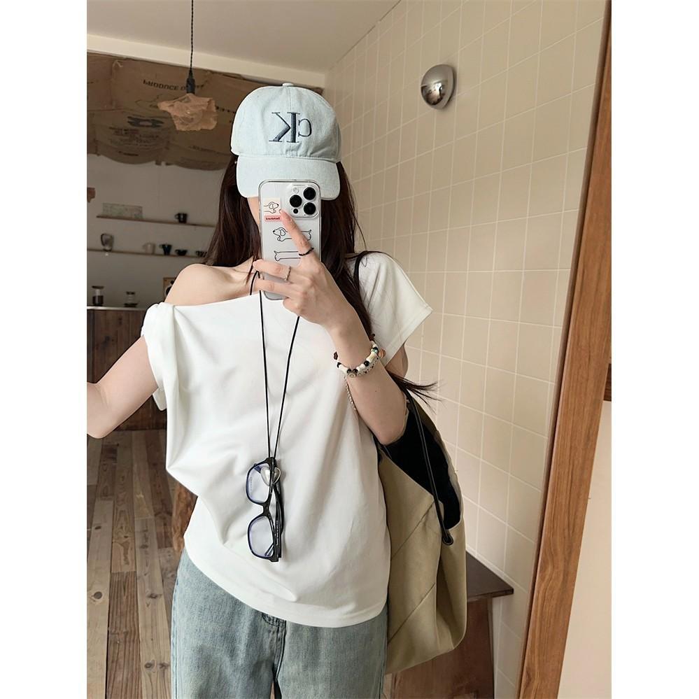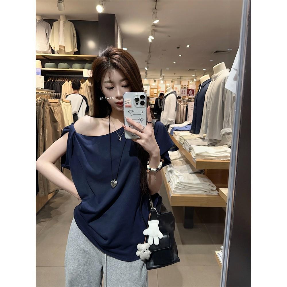 네이비 블루 트위스트 슬래시 넥 오프 숄더 반팔 티셔츠 여성 여름 새로운 디자인 루즈 슬리밍 오프 숄더 탑스토어 가기