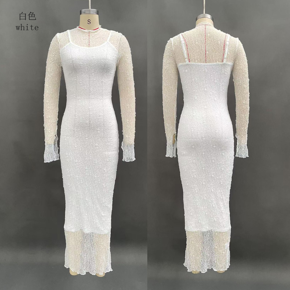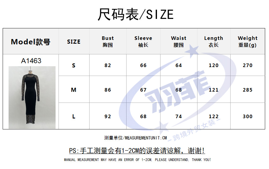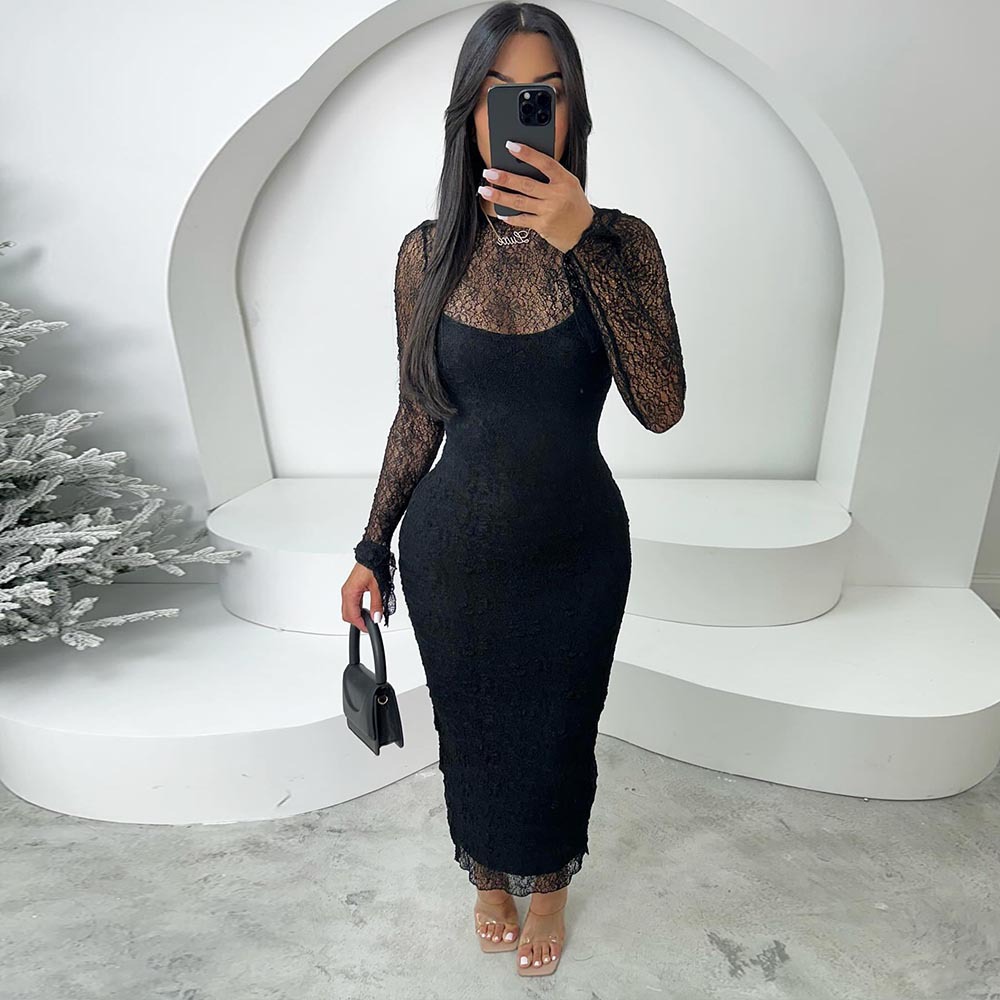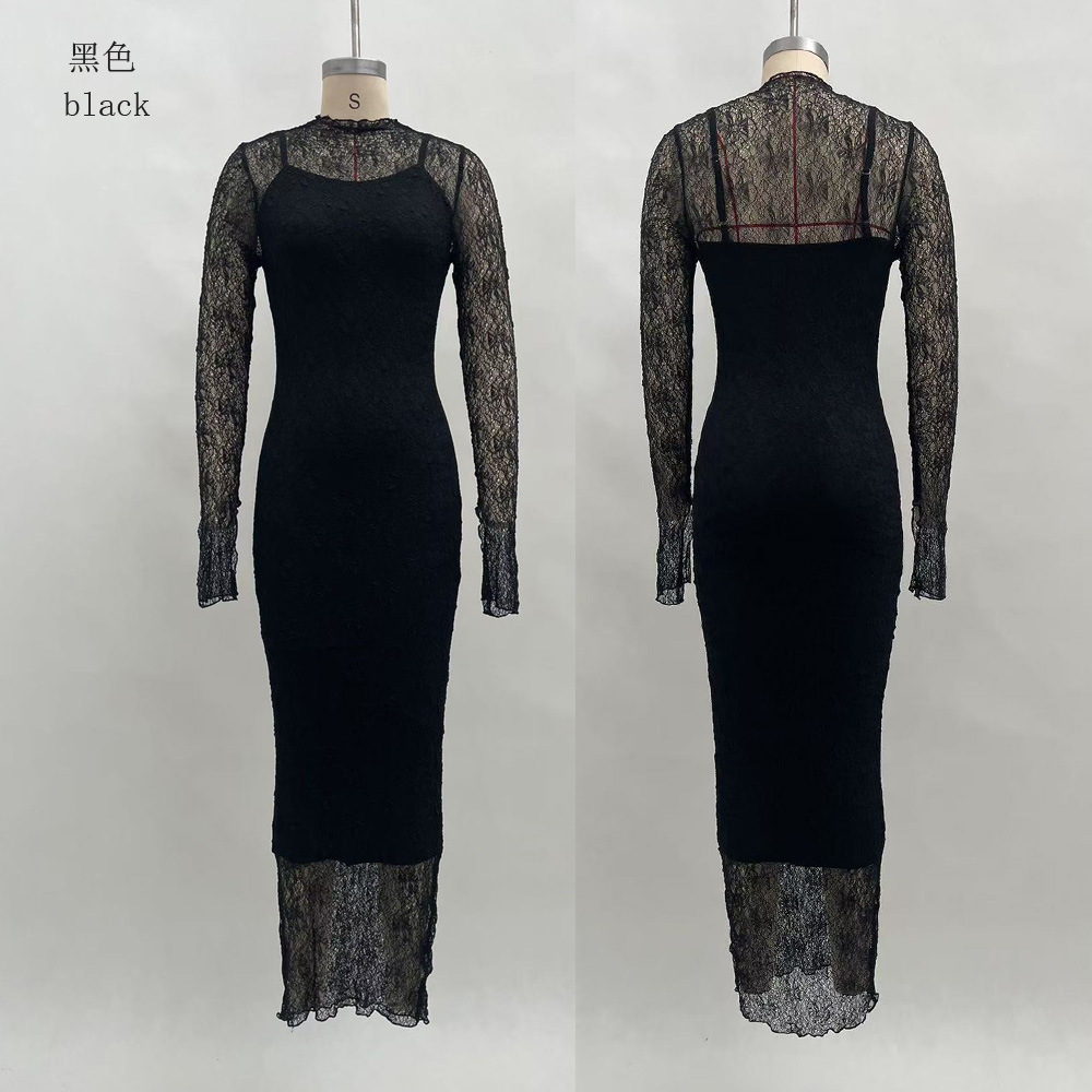 Amazon 국경 간 전용 2025 여름 신제품 섹시 슬림 레이스 시스루 유럽 및 미국 여성용 긴팔 드레스