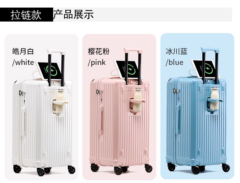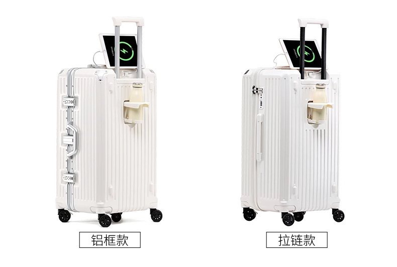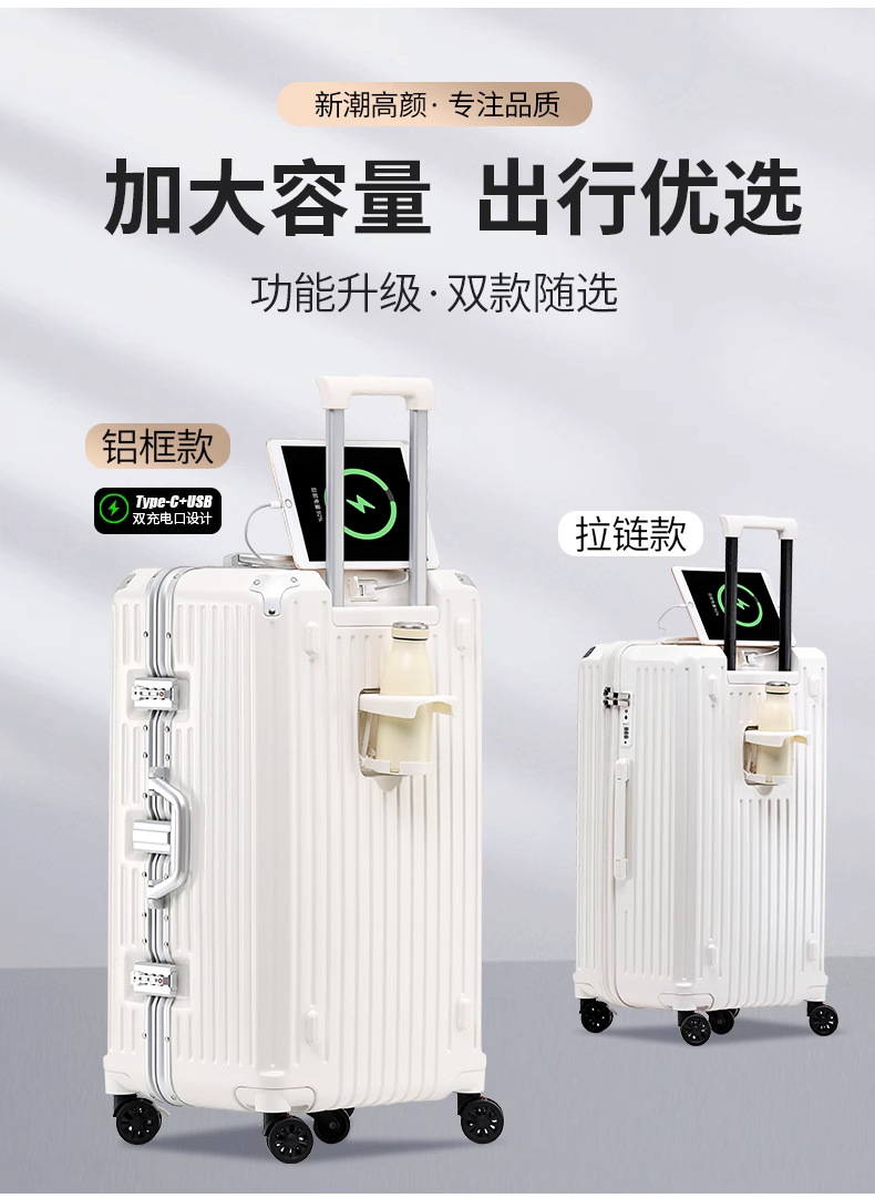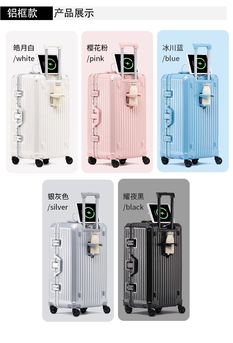 새로운 고급 컵 홀더 알루미늄 프레임 가방 여성용 트롤리 케이스 20inch 탑승 케이스 24inch 여행용 비밀번호 가죽 케이스스토어 가기