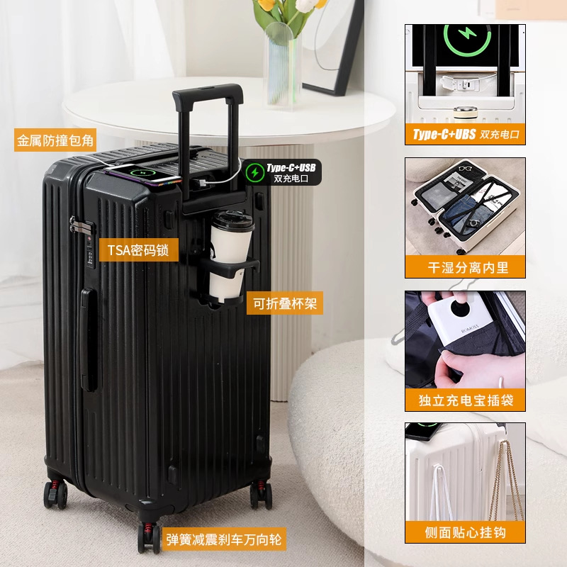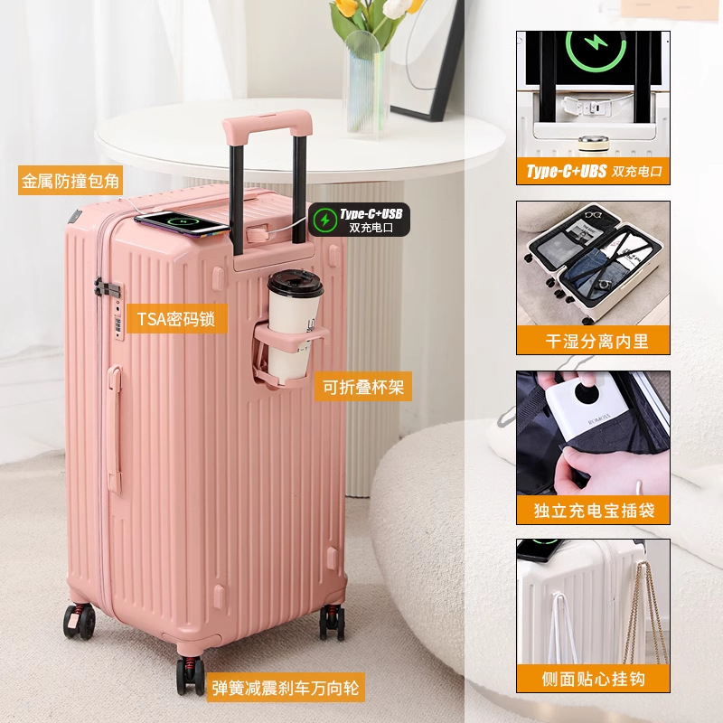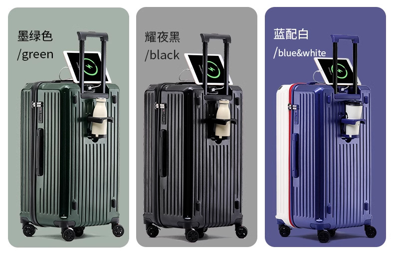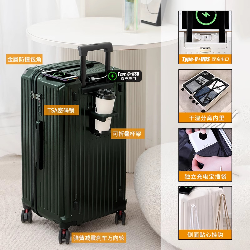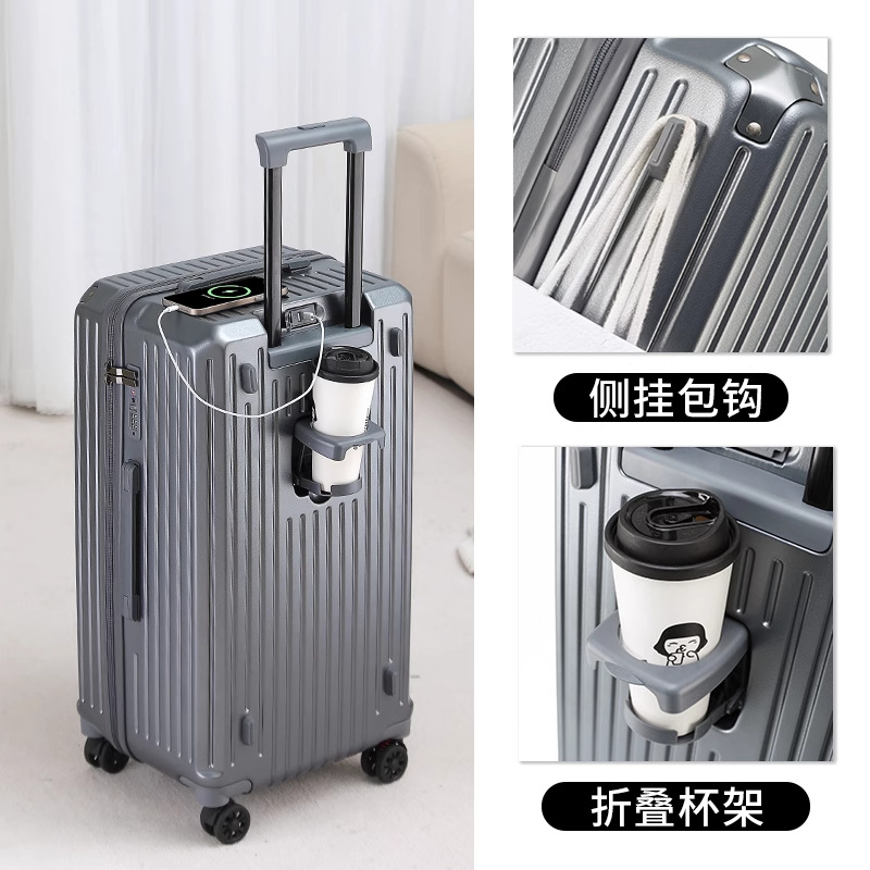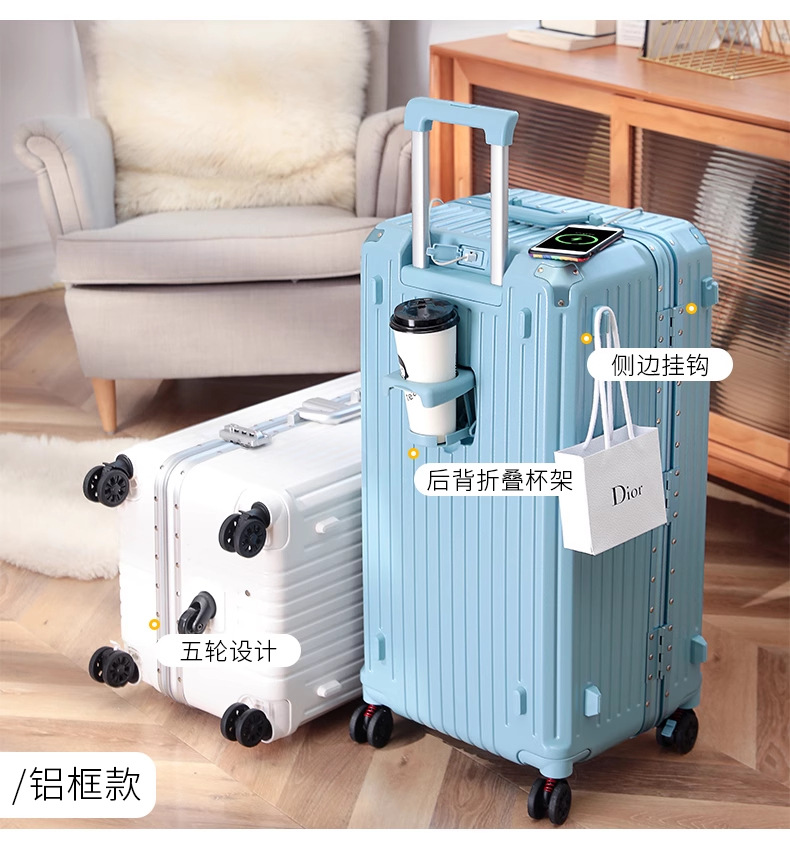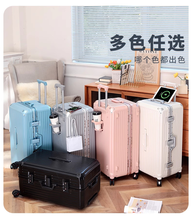 새로운 고급 컵 홀더 알루미늄 프레임 가방 여성용 트롤리 케이스 20inch 탑승 케이스 24inch 여행용 비밀번호 가죽 케이스