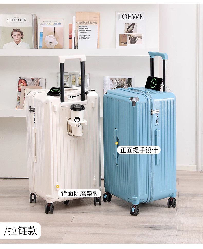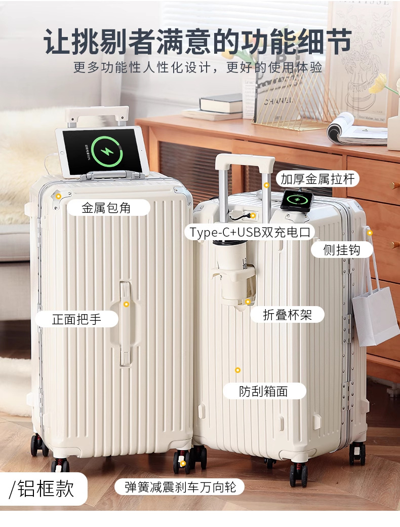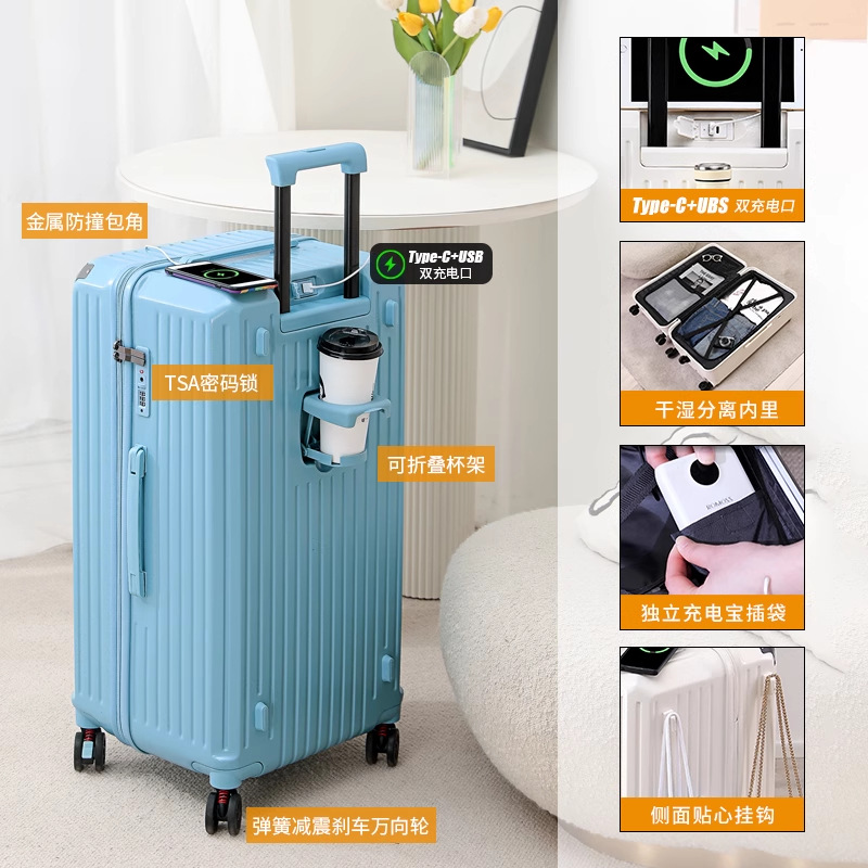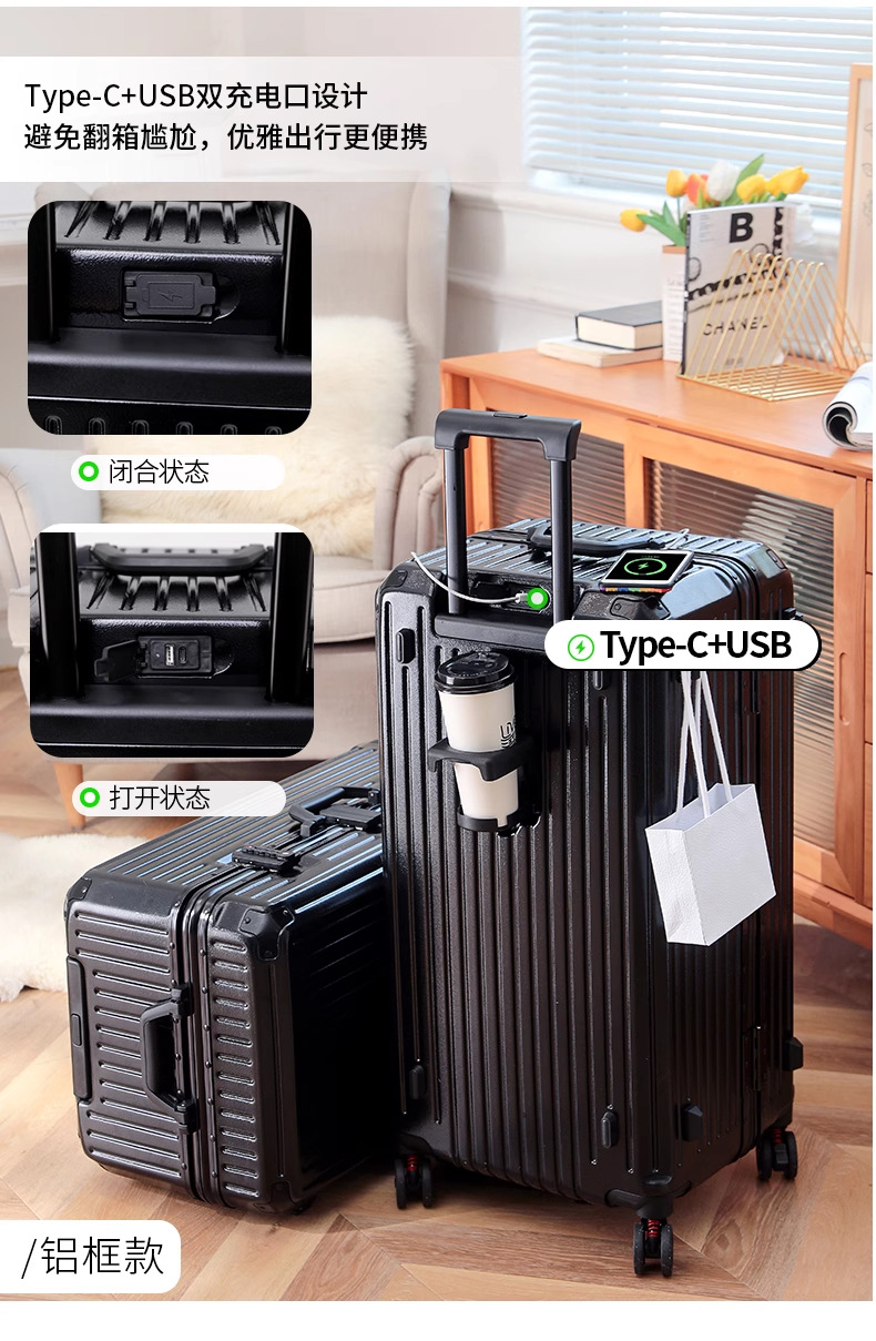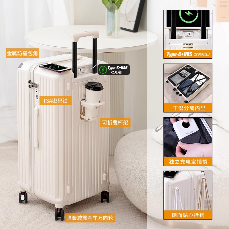 새로운 고급 컵 홀더 알루미늄 프레임 가방 여성용 트롤리 케이스 20inch 탑승 케이스 24inch 여행용 비밀번호 가죽 케이스