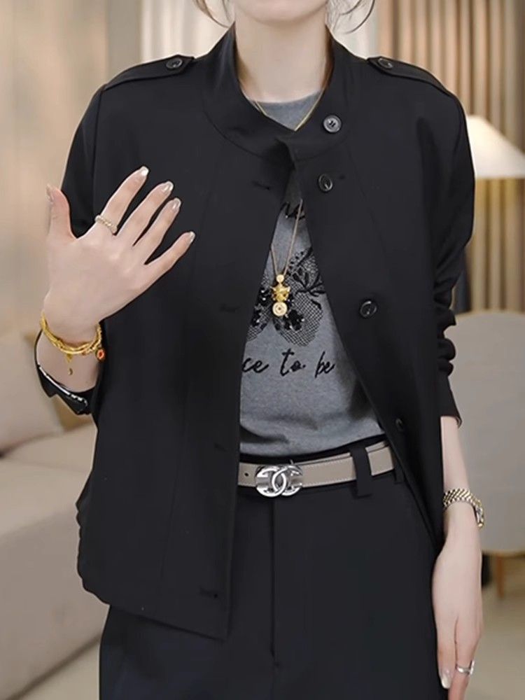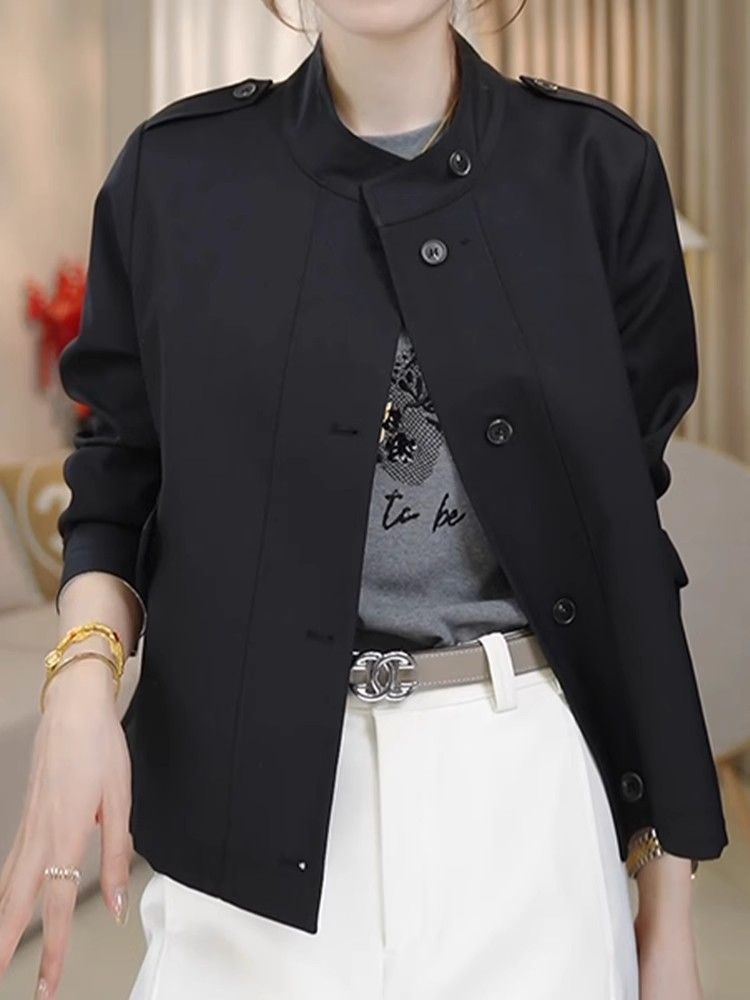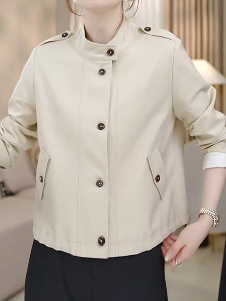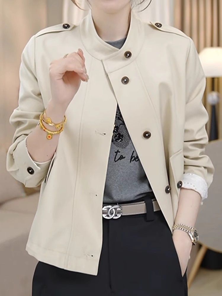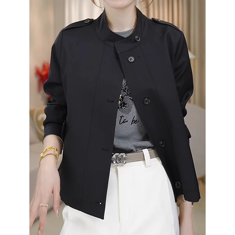 여성을위한 스탠드 업 칼라 느슨한 슬림 짧은 코트 2025 봄, 가을 밑단 드로스트링 디자인 세련된 캐주얼 다목적 탑 재킷