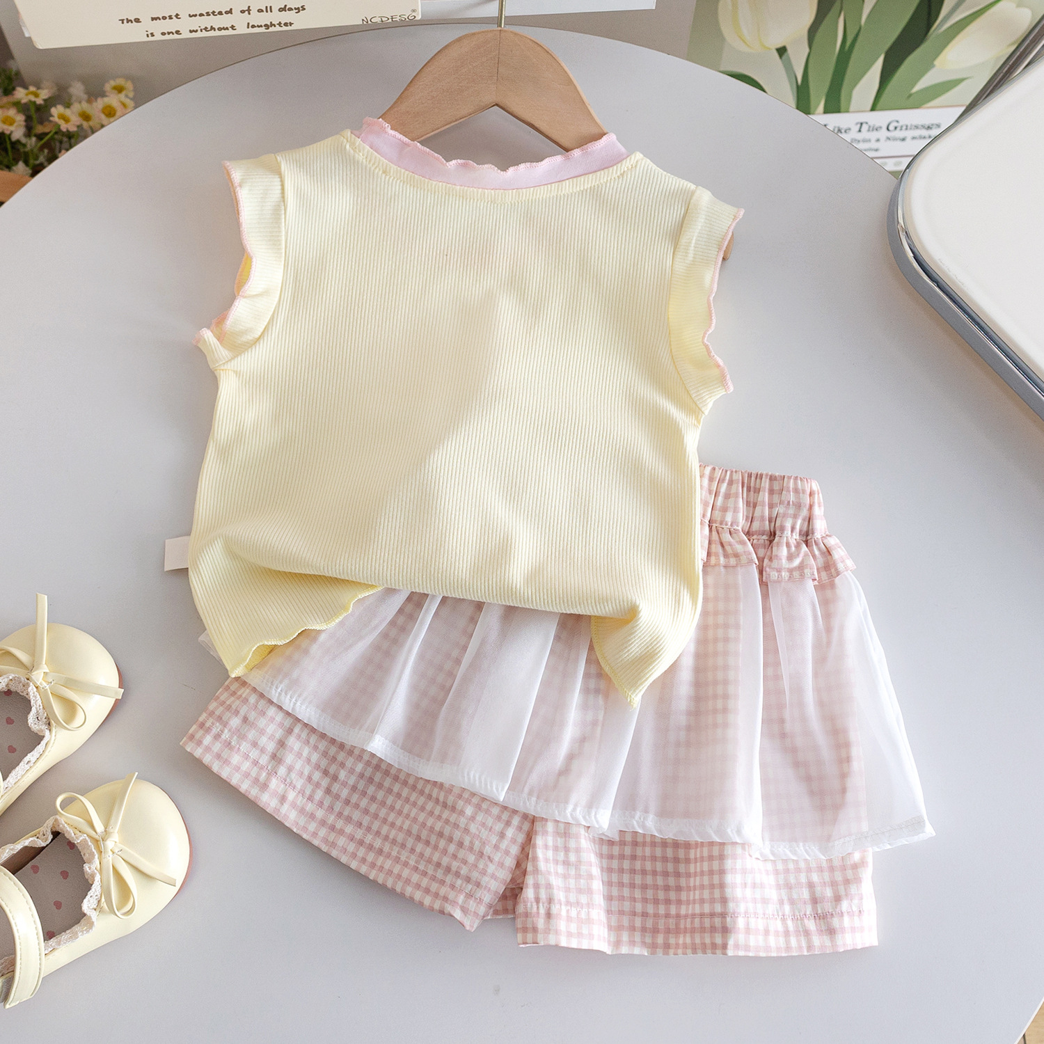 2025 여름 소녀 베이지색 조끼 핑크 격자 무늬 레이스 바지 아기 소녀 유행 귀여운 순수 코튼 소녀 정장스토어 가기