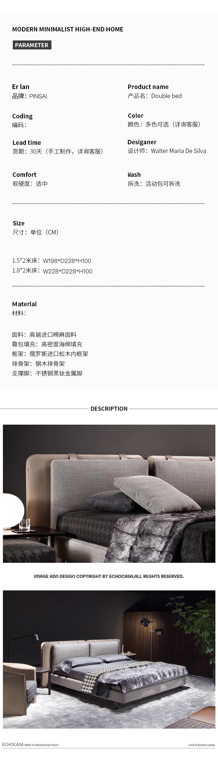 이탈리안 미니멀리스트 학교 가방 침대 더블 침대 면 및 린넨 패브릭 침대 안장 가죽 하이 엔드 마스터 침실 웨딩 침대 Tatlin 침대 없음스토어 가기
