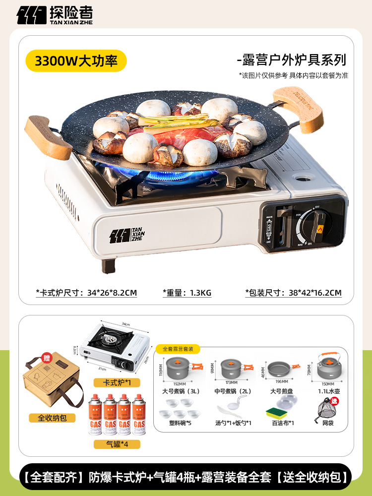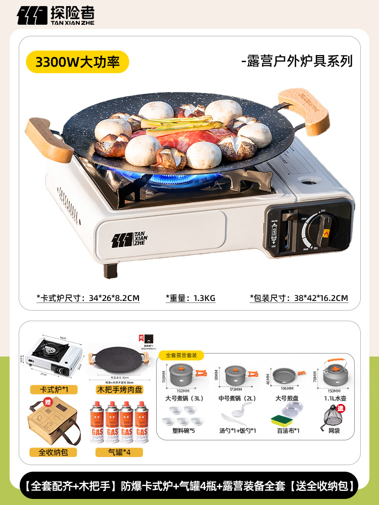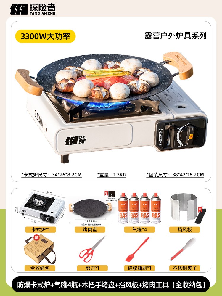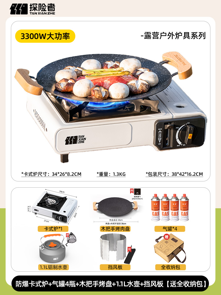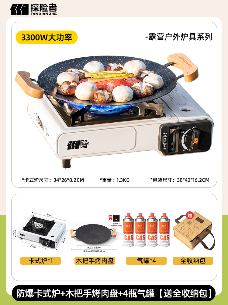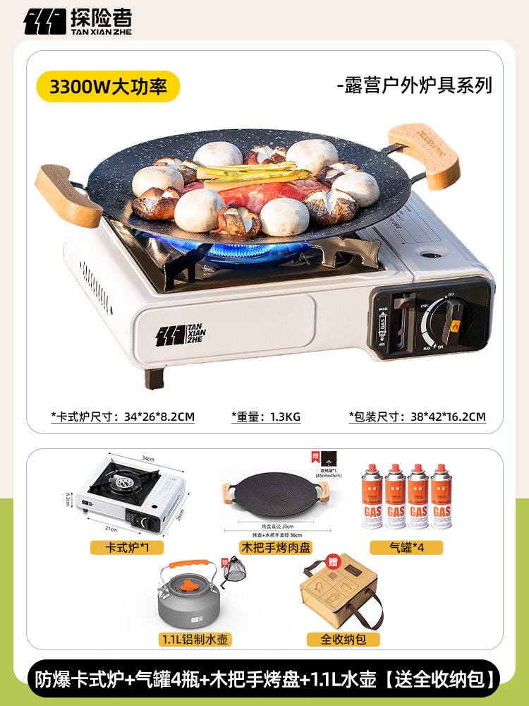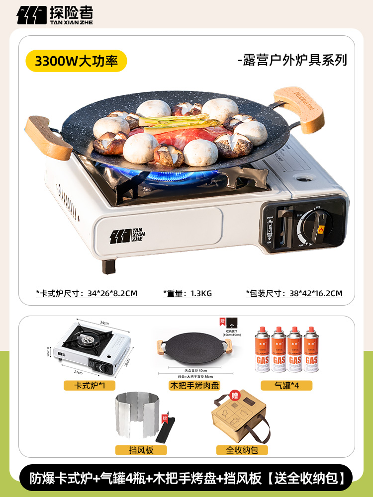 • 방폭 카세트 스토브 + 나무 손잡이 바베큐 플레이트 + 가스 탱크 4병