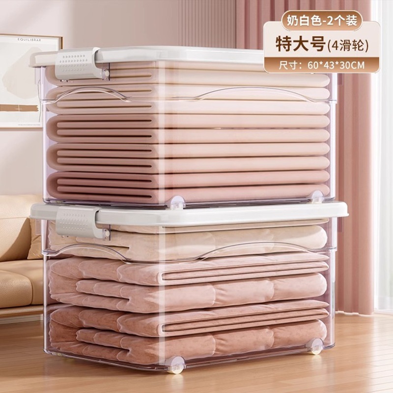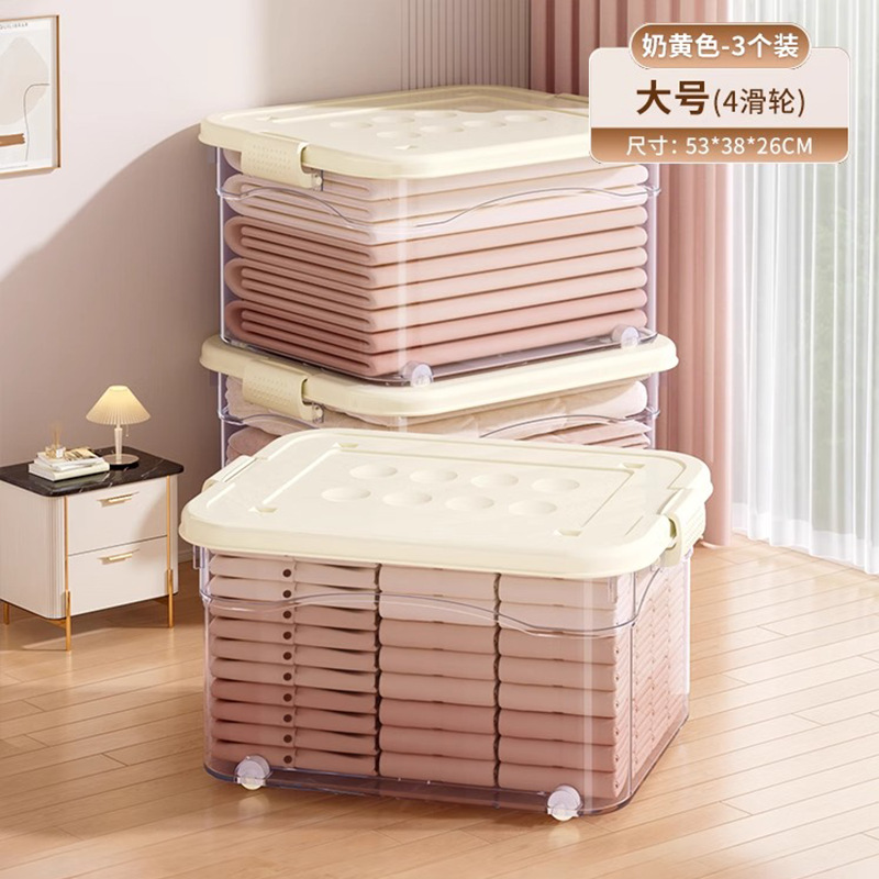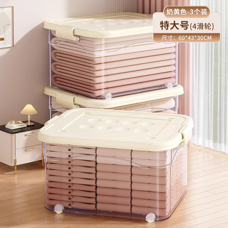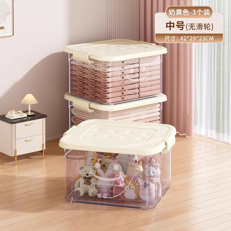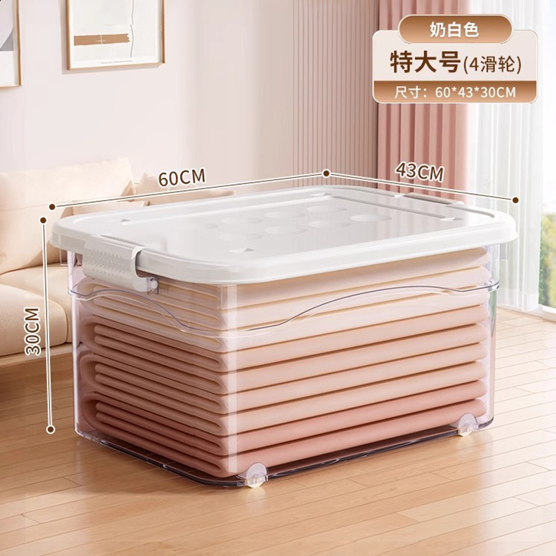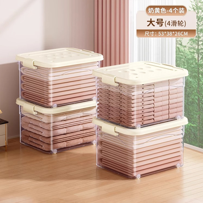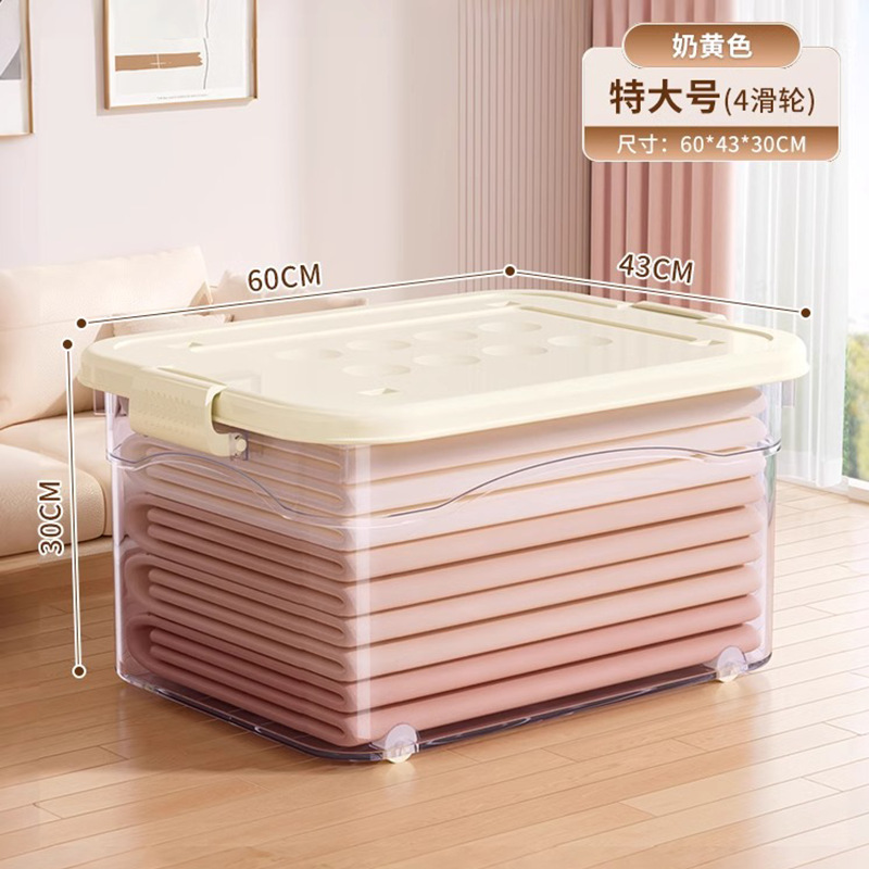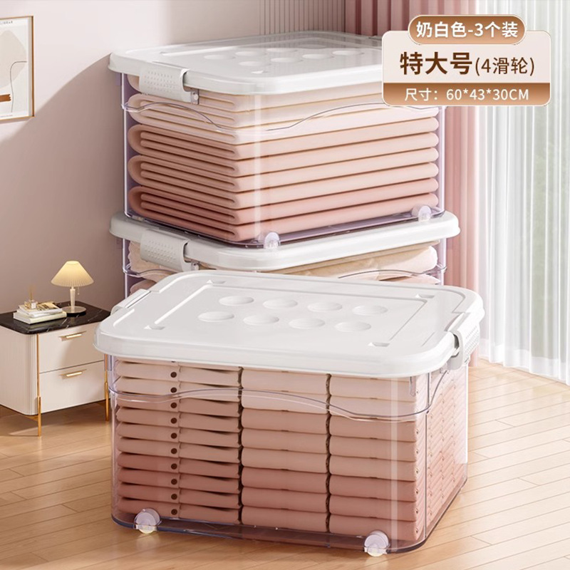 투명 플라스틱 상자 가정용 의류 이불 보관 상자 뚜껑이있는 어린이 장난감 도서 보관 상자 바퀴가있는 보관 상자